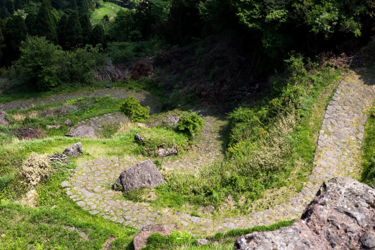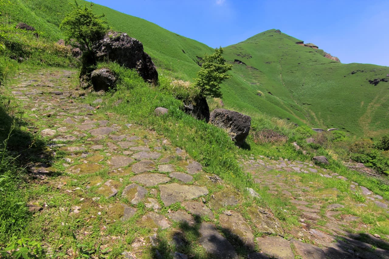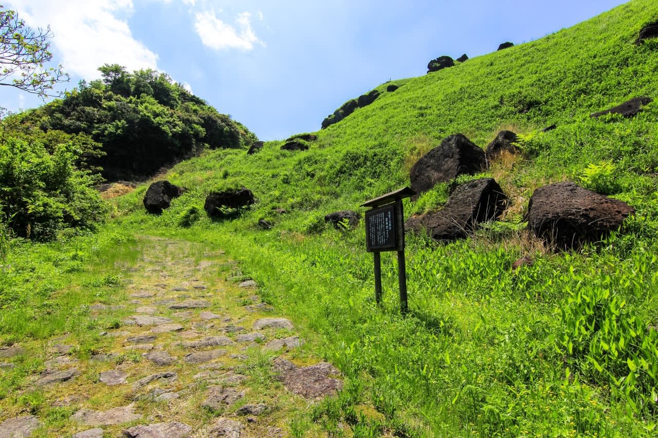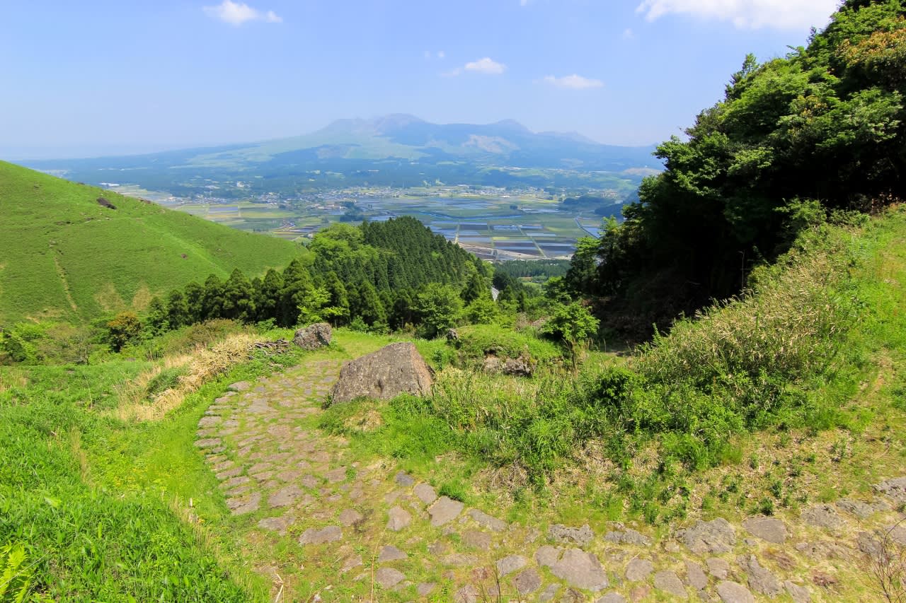 아소 칼데라와 웅장한 활화산인 아소산을 한눈에 볼 수 있는 후타에노토게에서 도보 여행을 시작합니다. 저희가 걷는 산책로는 구마모토(히고 국)와 도쿄(에도)를 연결하는 400년 이상의 역사를 지닌 구 분고 가도로, 예로부터 칼데라 바깥쪽 가장자리의 초원 지대로 통하는 길입니다.