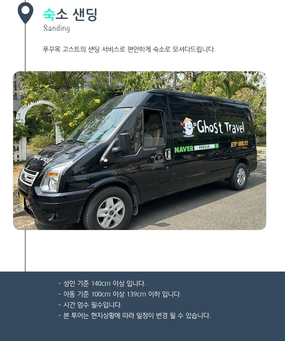 * 카카오채널로 연락주셔야 예약확정 가능하니 반드시 예약시에는 해당 카카오 채널로 연락바랍니다. (카톡검색시 @푸꾸옥고스트투어) * 베트남 국/공휴일에는 인건비, 차량비 등이 인상되는 관계로 추가금(현지지불 등)이 발생될 수 있습니다.