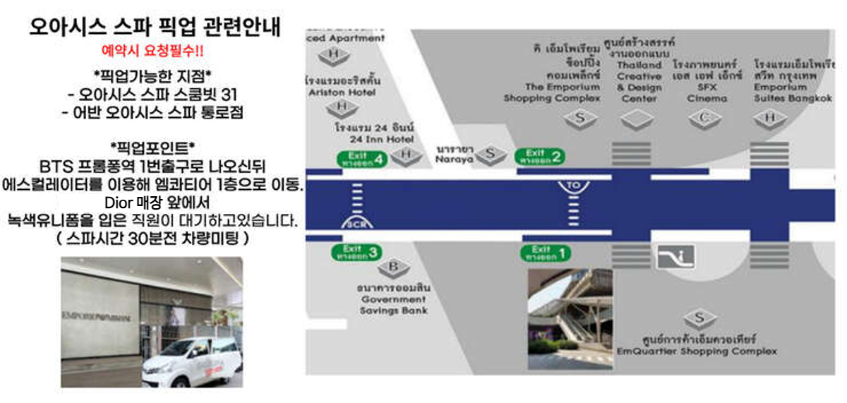 ▶ 주의사항 - 👶 아동 이용 안내 아동은 일부 지정된 프로그램만 예약 가능합니다. 그 외 프로그램을 예약하실 경우, 확정되더라도 현장에서 이용이 제한될 수 있으며, 이로 인한 환불은 불가하오니 예약 시 반드시 확인 부탁드립니다. - 🤰 임산부 이용 안내 임산부 프로그램의 경우 에이전시를 통한 예약이 불가합니다. 스파로 직접 예약해주세요. 예약 가능 프로그램 : 마미스 딜라이트, 오 베이비, 래디언트 마더후드 마사지 예약 메일: Res@oasisspa.net - 🚿 스파 전/후 샤워 규정 각 방마다 샤워 시설이 있습니다. 마사지 전/ 후로 샤워 가능하나 10분 이내로 끝내야 한다고 합니다. 스파 사정에 따라 불가능 할 수도 있으며, 오일테라피 같은 경우 , 마사지 후 오일을 바로 씻어내지 않는 것을 권유 드린다고 합니다. - 🔸 그 외 안내사항 예약 시간보다 일찍 도착하시길 권장 드리며, 15분 이상 늦으실 경우 NO SHOW로 예약 취소 처리됩니다. (변경 및 환불 100% 불가) 음주자, 규정 외 임산부, 노약자는 안전상의 이유로 서비스 이용이 거부될 수 있습니다. 이 경우 환불은 불가 합니다. 개인적인 질환이나 특이사항(알러지, 약물복용, 임산부, 피해야 할 신체 부분 등)이 있으실 경우 스파 전, 스파 측과 미리 확인하시고 진행해주셔야 합니다. 스파 전 미리 상의하지 않고 문제 발생 시 도움을 드리기 어려운 점 참고해주세요. - 🚗 픽업 안내 사항 BTS 프롬퐁 역에서 도보로 약 20분이 걸리기 때문에 스파에서 제공하는 셔틀 서비스를 이용하실 수 있어요. 프롬퐁(Phromphong BTS)역 1번 출구, Dior (엠콰티어백화점) 매장 앞에서 이용 시간 30분 전 픽업 가능합니다. 픽업을 원하시는 분은 예약 신청 시 요청해 주세요. 예약 신청 시 요청 못하신 경우 늦어도 하루 전에는 요청해주셔야 하며, 스파 이용 당일에는 픽업 요청이 불가능합니다. 픽업 시간 5~10분 전 부터 대기해 주세요. 늦으면 기다려 드리지 않아 직접 이동해야 됩니다. 다른 장소로의 픽업 및 샌딩은 불가능합니다