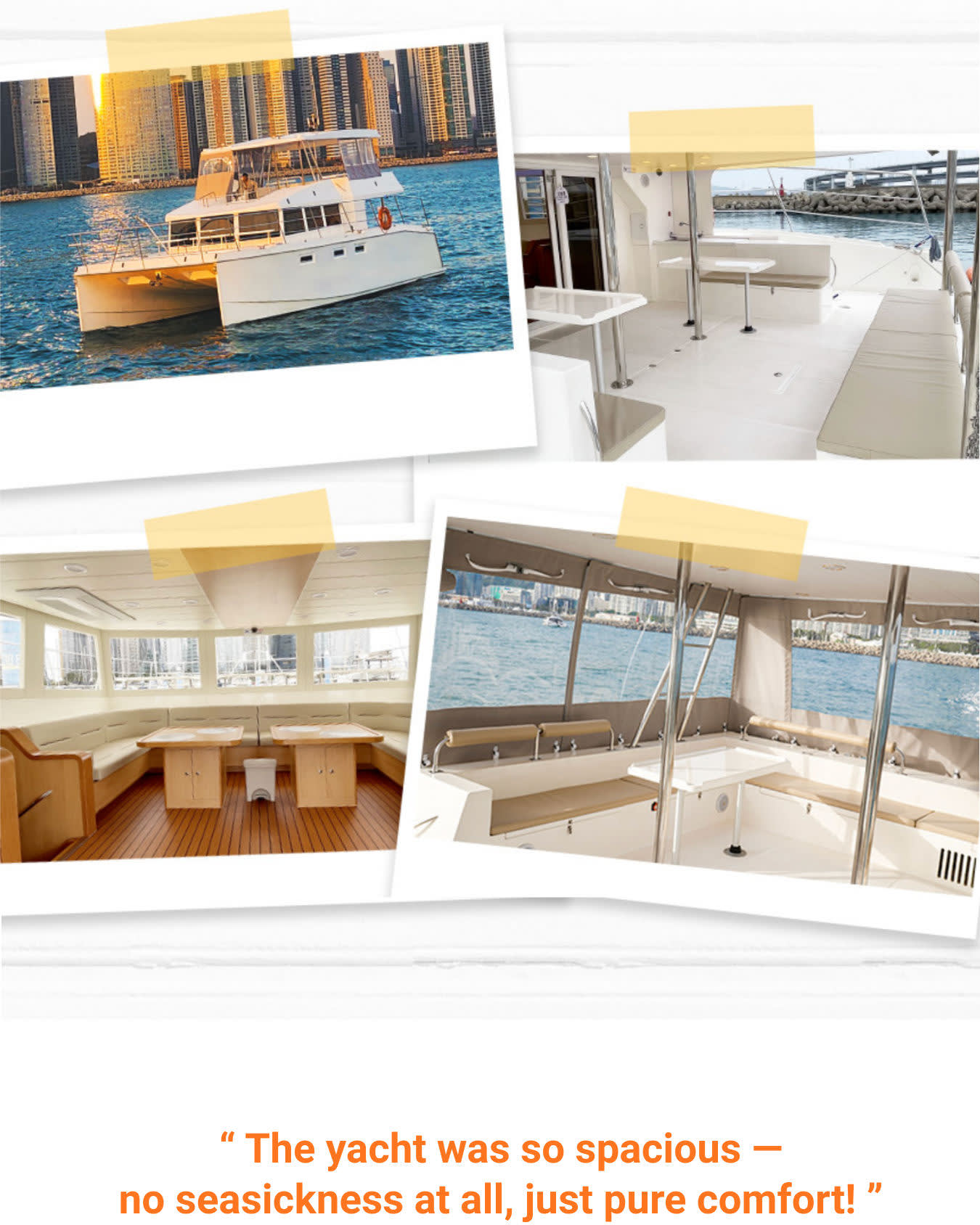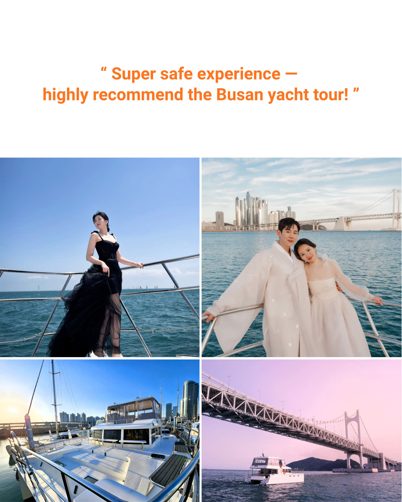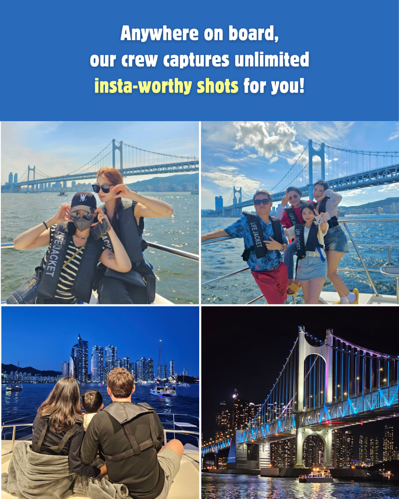 * 사진 인화 특별 서비스 (팀당 1장) + 최고의 사진을 찍어주는 직원 부산 여행을 추억할 수 있도록 운동화는 안 돼요! 내 신발을 신고 요트에 탑승하세요. * 아무도 신지 않은 신발이라 깨끗합니다. * 해양구조대 SSU 소속 안전요원 탑승 * 베이스가 가득한 사운드 시설 * 3600개 이상의 파노라마 불꽃놀이 쇼 (선셋/야경 투어)
