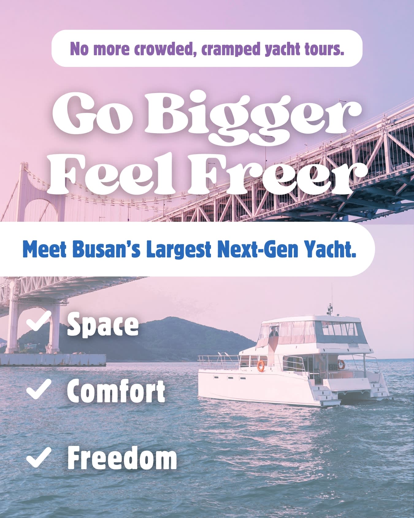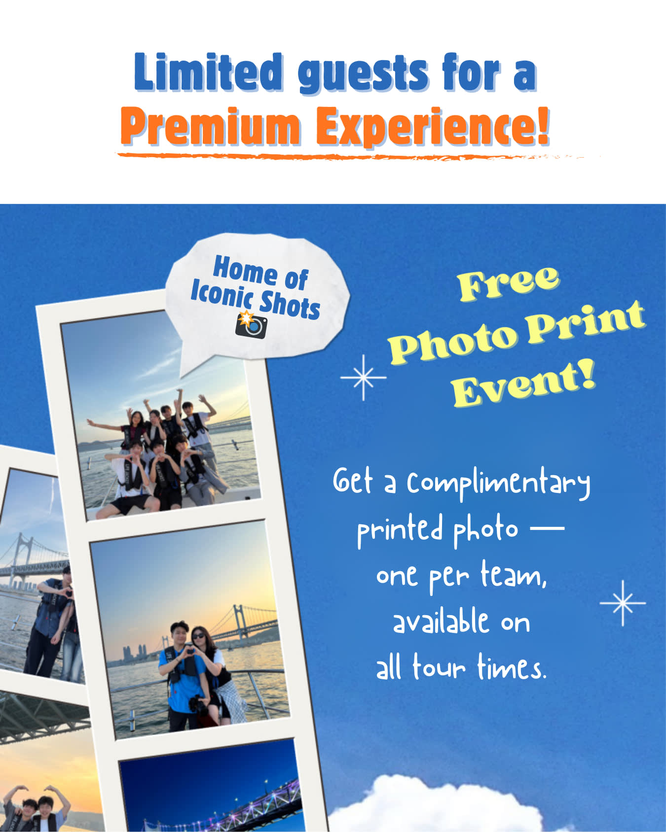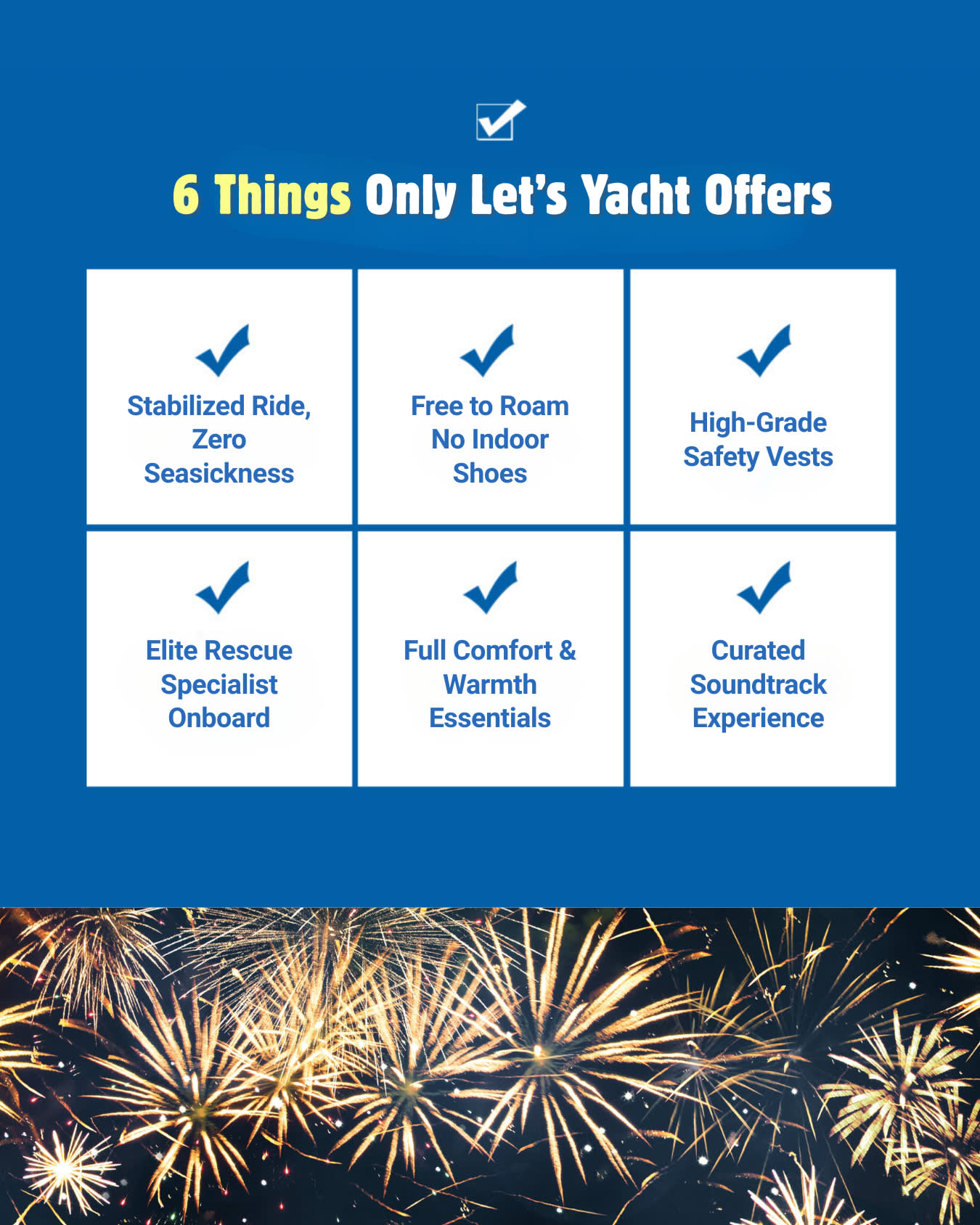 * 사진 인화 특별 서비스 (팀당 1장) + 최고의 사진을 찍어주는 직원 부산 여행을 추억할 수 있도록 운동화는 안 돼요! 내 신발을 신고 요트에 탑승하세요. * 아무도 신지 않은 신발이라 깨끗합니다. * 해양구조대 SSU 소속 안전요원 탑승 * 베이스가 가득한 사운드 시설 * 3600개 이상의 파노라마 불꽃놀이 쇼 (선셋/야경 투어)