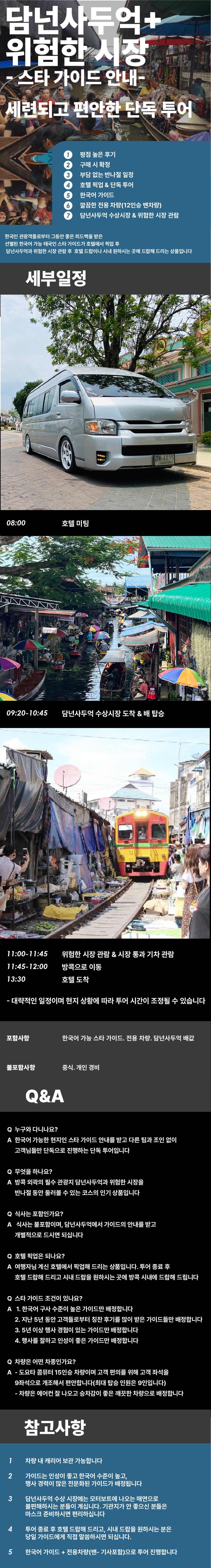 • 한국인 관광객들로부터 그동안 좋은 피드백을 받은 선별된 한국어 가능 태국인 스타 가이드들이 호텔에서 픽업 후 담넌사두억과 위험한 시장 투어를 편안하고 즐겁게 안내해드리는 상품입니다.