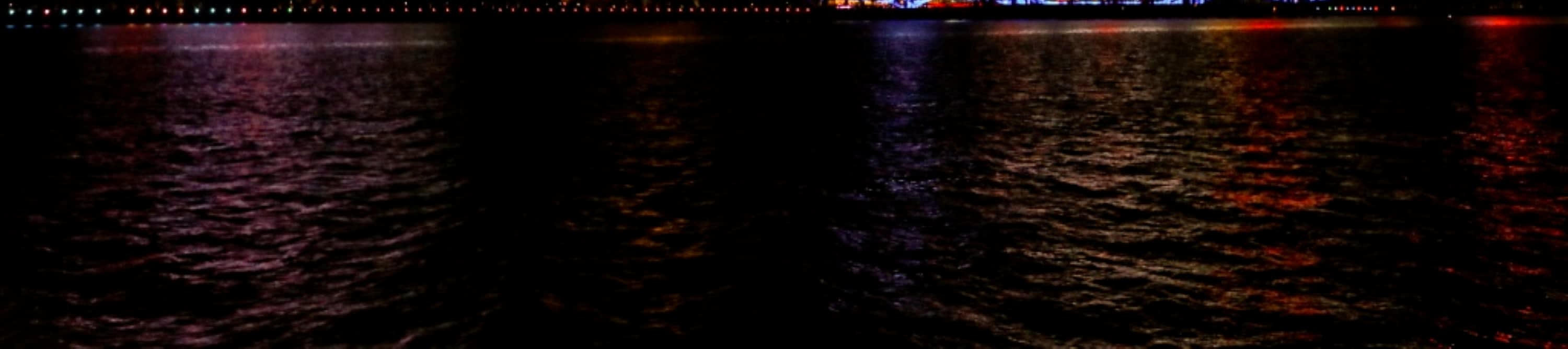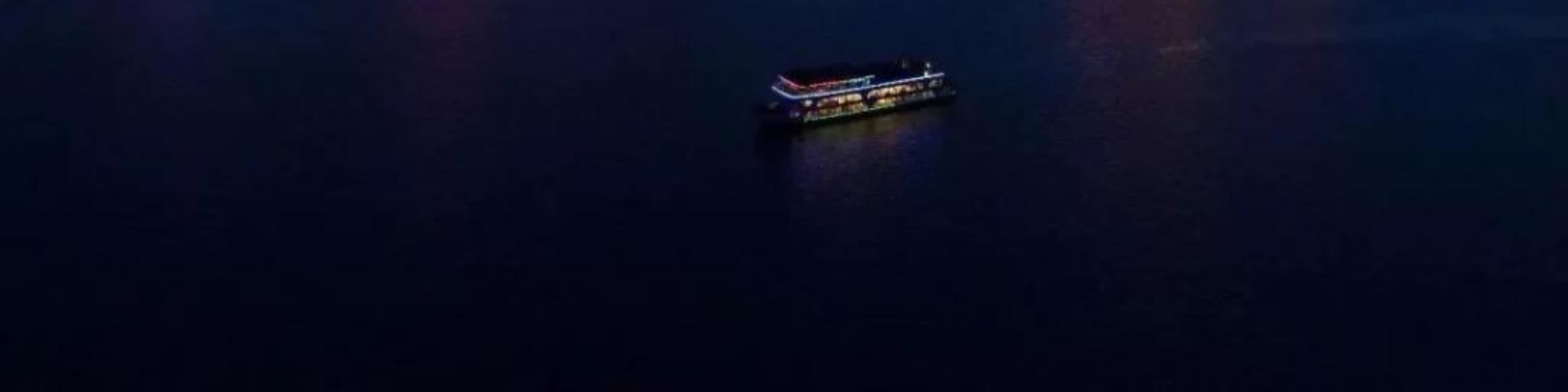 * 배를 타고 강 중심을 가르며 고층 빌딩 스카이라인과 달빛의 조화로운 풍경 감상