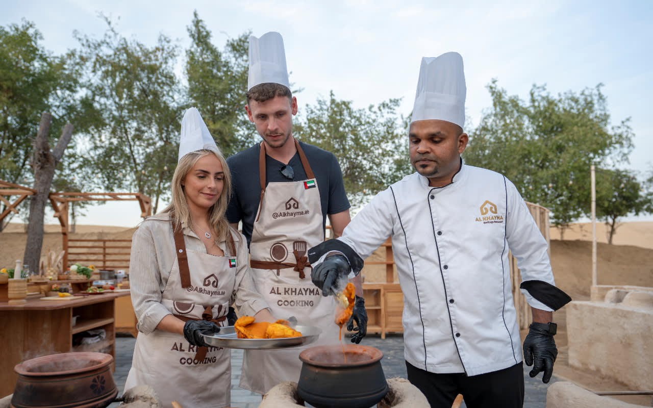 알 마르뭄 오아시스 쿠킹 장소에서 여정을 시작하세요. 따뜻한 에미리트 환대를 받으며 몰입감 있는 실습 요리 체험에 참여하게 됩니다. 닭고기, 양고기 또는 채식 메뉴 중에서 선택할 수 있으며, 각 메뉴는 전통적인 기술과 신선한 재료로 준비된 전통 요리를 특징으로 합니다. 마즈부스, 코프타, 티카 또는 야채 살루나와 같은 고전 요리를 아랍식 샐러드와 갓 구운 레각 빵과 함께 만드는 법을 배우세요. 요리 후에는 아늑한 베두인 스타일 라운지에서 휴식을 취하며 직접 만든 식사를 즐기고 문화 이야기와 음악을 감상하세요. 저녁에는 매 사냥 사진, 아라비아 말과 낙타 만나기, 간단한 헤나 아트 체험 등 독특한 문화 체험이 이어지며 기억에 남고 풍요로운 사막 경험을 선사합니다.
