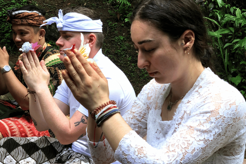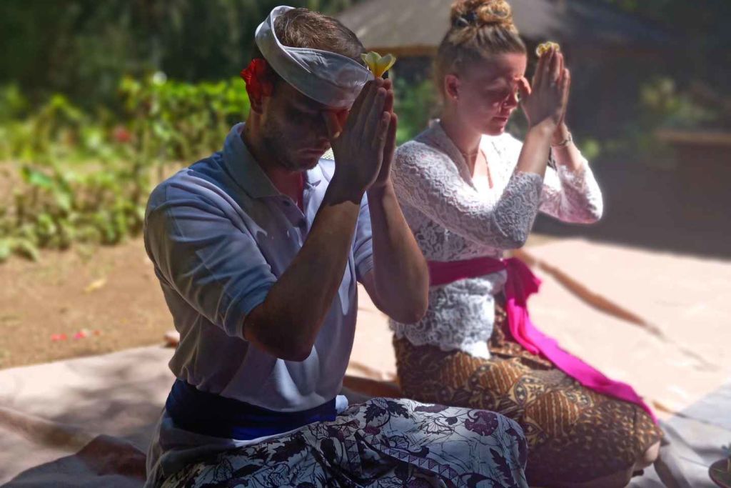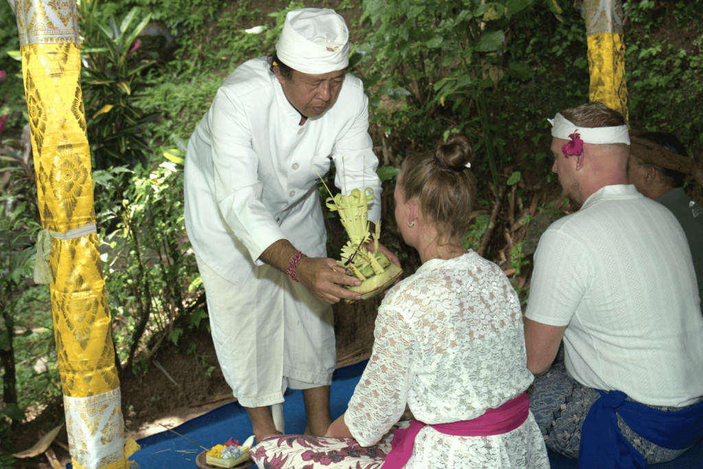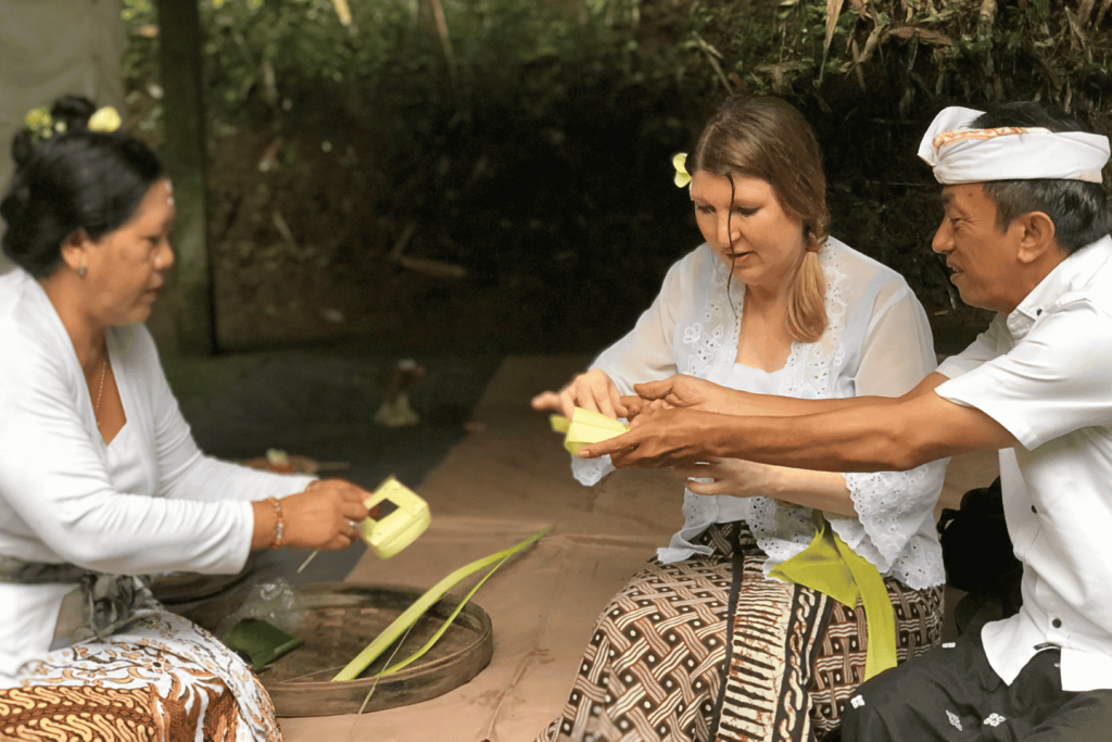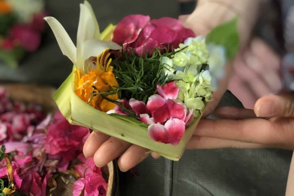 이 의식은 특별히 여러분을 위해 준비되었으며 신성하고 영적인 사원에서 진행됩니다. 마을 사제(망쿠)와 함께 정화 의식에 필수적인 다채로운 꽃 제물을 만들게 됩니다. 이 제물은 쌀, 향기로운 향, 성수와 함께 정화와 축복 의식에 사용됩니다. 물은 몸과 마음을 정화하고 에너지를 되살리는 역할을 합니다. 개인 투어 가이드가 의식 내내 상주하며 자세한 설명을 제공합니다.
