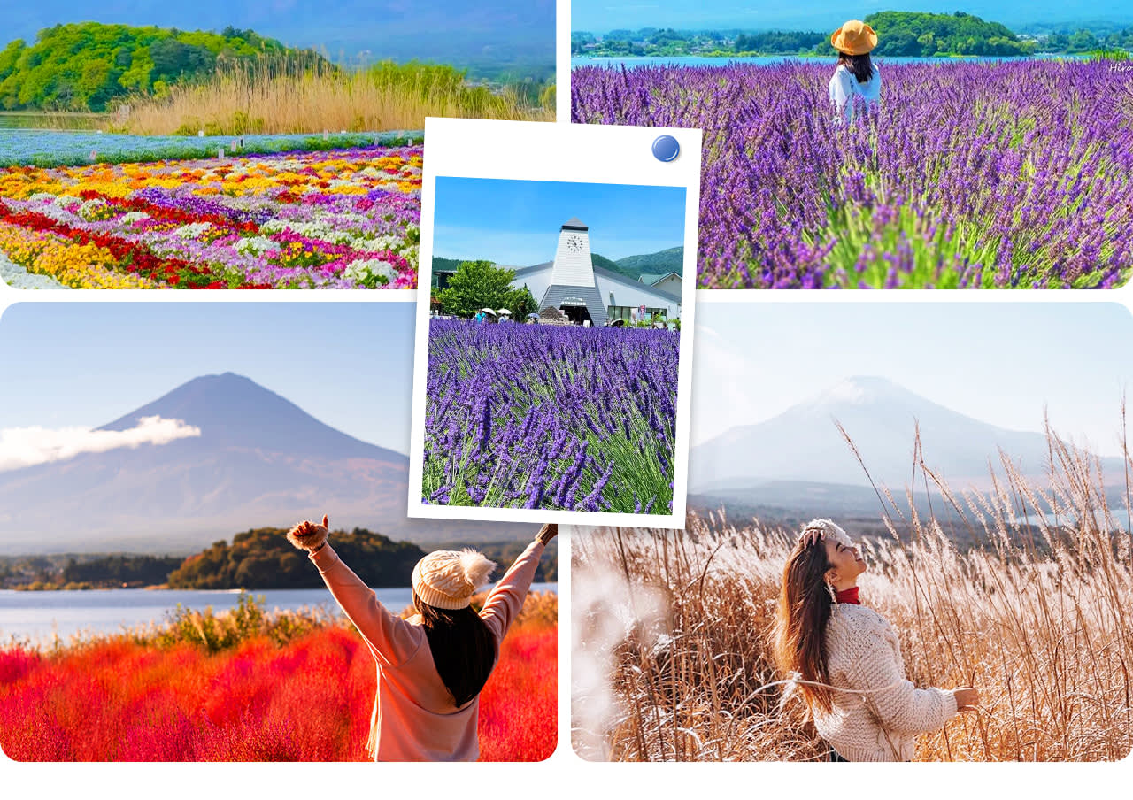 * 가와구치 호수 오이시 공원: 봄에는 벚꽃, 여름에는 라벤더, 가을에는 단풍이 아름다워 계절마다 특별한 풍경을 선사합니다.