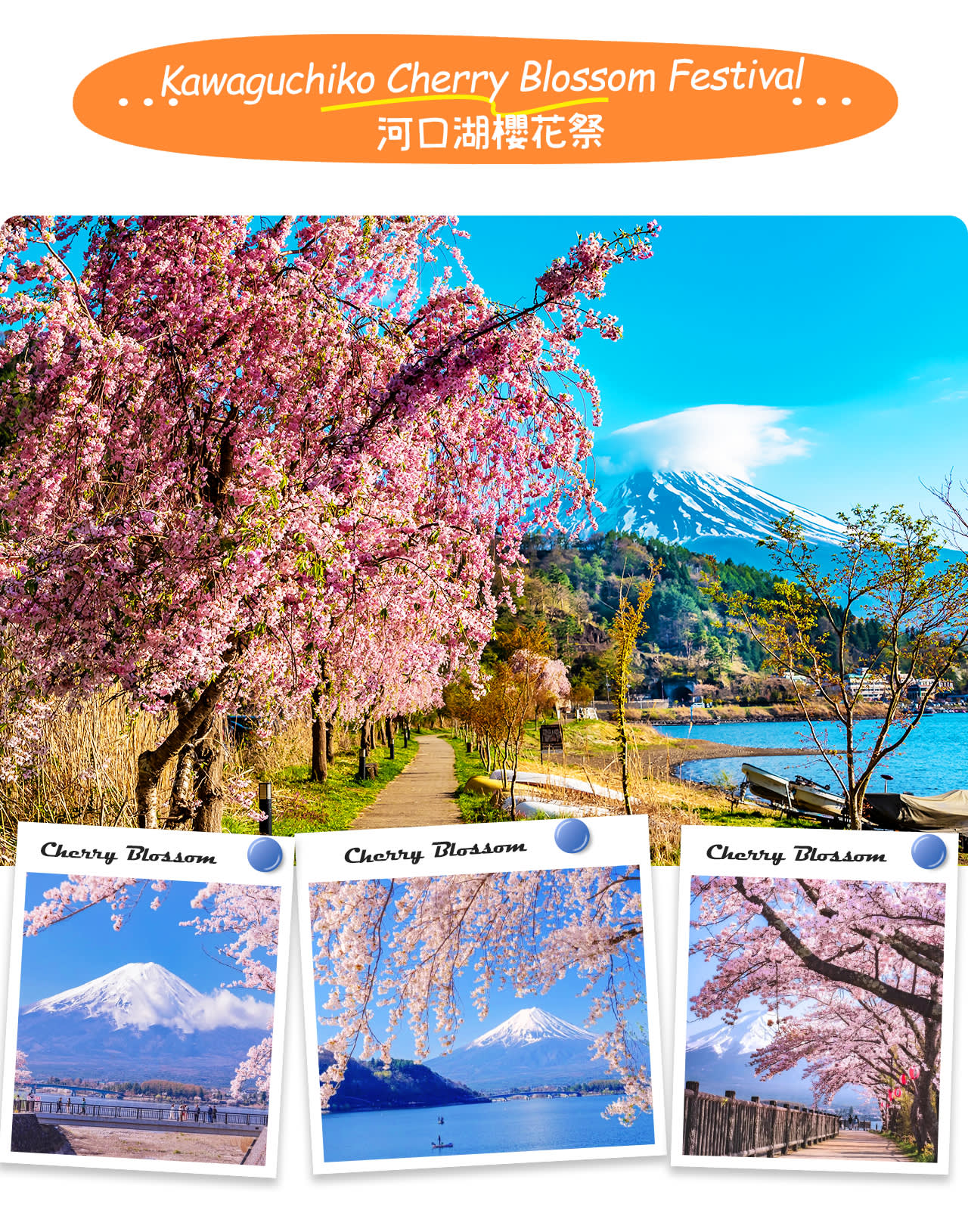 가와구치 호수 벚꽃 축제(4월 1일~13일) 가와구치 호수 북쪽은 후지 지역의 유명한 벚꽃 명소로, 핑크빛 벚꽃 바다와 어우러진 후지산은 숨 막힐 듯 아름답습니다!