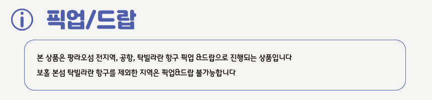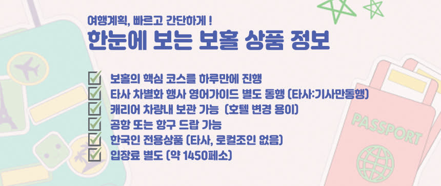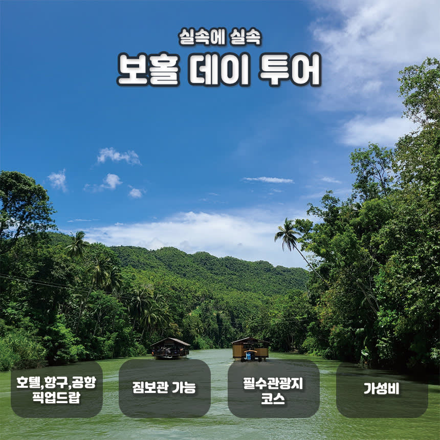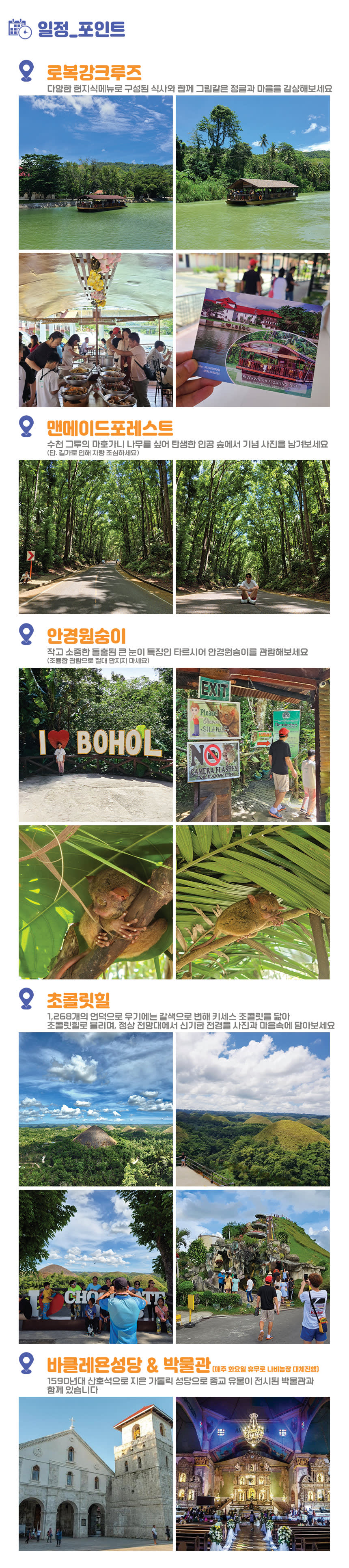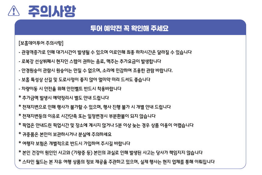 [보홀데이투어 주의사항] - 관광객증가로 인해 대기시간이 발생될 수 있으며 이로인해 최종 하차시간은 달라질 수 있습니다 - 로복강 선상뷔페시 현지인 스텝이 권하는 음료, 맥주는 추가요금이 발생합니다 - 안경원숭이 관람시 원숭이는 만질 수 없으며, 소리에 민감하여 조용한 관람 바랍니다. - 보홀 특성상 산길 및 도로사정이 좋지 않아 멀미약 미리 드셔도 좋습니다 - 차량이동 시 안전을 위해 안전벨트 반드시 착용바랍니다 - 단독투어시 스케줄 조정 가능합니다 - 조인투어시 원치 않은 관광지는 외부 대기입니다 * 추가금액 발생시 예약정리시 별도 안내 드립니다 * 천재지변으로 인해 행사가 불가할 수 있으며, 행사 진행 불가 시 개별 안내 드립니다 * 천재지변등의 이유로 시간단축 또는 일정변경시 부분환불이 되지 않습니다 * 픽업은 안내드린 픽업시간 및 장소에 계시지 않거나 5분 이상 늦는 경우 상품 이용이 어렵습니다 * 귀중품은 본인이 보관하시거나 분실에 주의하세요 * 여행자 보험은 개별적으로 반드시 가입하여 주시길 바랍니다 * 본인 건강이 원인인 사고와 (기왕증 등) 본인의 과실로 인해 발생된 사고는 당사가 책임지지 않습니다 * 스타인 월드는 본 자유 여행 상품의 정보 제공을 주관하고 있으며, 실제 행사는 현지 업체를 통해 이뤄집니다