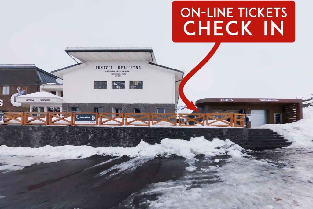 '에트나 케이블카(Funivia dell'Etna)' 매표소 왼쪽에 있는 전용 사무소(사진 참조)에서 QR 코드를 확인하세요.온라인 구매자만 이용할 수 있는 이 오시는 길에서는 디지털 바우처를 실제 티켓으로 교환할 수 있습니다.