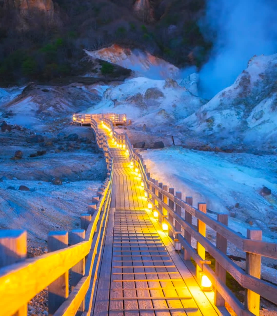 * 노보리베쓰 지옥계곡 지열 산책로를 거닐며 증기가 솟아오르는 모습과 바위 벌판의 기이한 경치가 공존하는 웅장한 지형을 감상하다