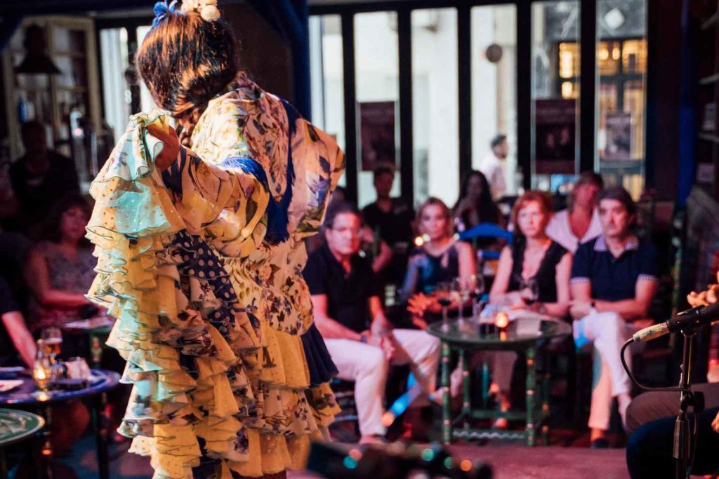 문 앞에서 티켓을 제시하고 전통적이고 아늑한 분위기의 매력적인 공간으로 들어가세요. 타블라오 댄스 플랫폼 주변에 자리를 잡고 무용수의 감성적인 움직임과 함께 우아하게 흐르는 화려한 색상의 의상에 빠져보세요.