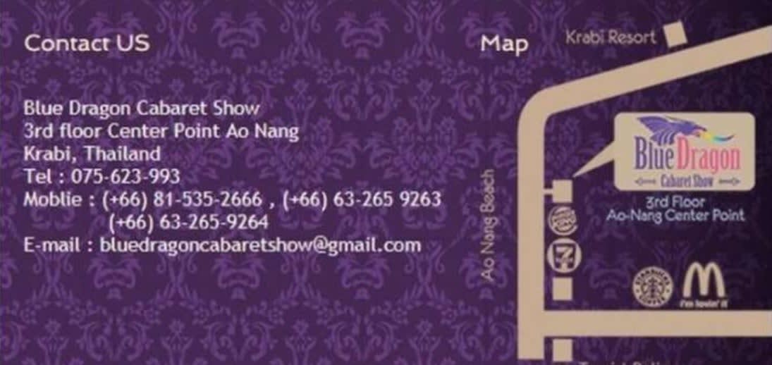 423/1, 81180, ถนนกระบี่เขาทอง ตำบล อ่าวนาง อำเภอเมืองกระบี่ กระบี่ 81000https://www.google.com/maps/place/Bluedragon+Cabaret/@8.0336423,98.8200826,15z/data=!4m6!3m5!1s0x3051c009536370e5:0xad1496d26dee87b9!8m2!3d8.0336423!4d98.8200826!16s%2Fg%2F11c4bp4vrv?hl=ko