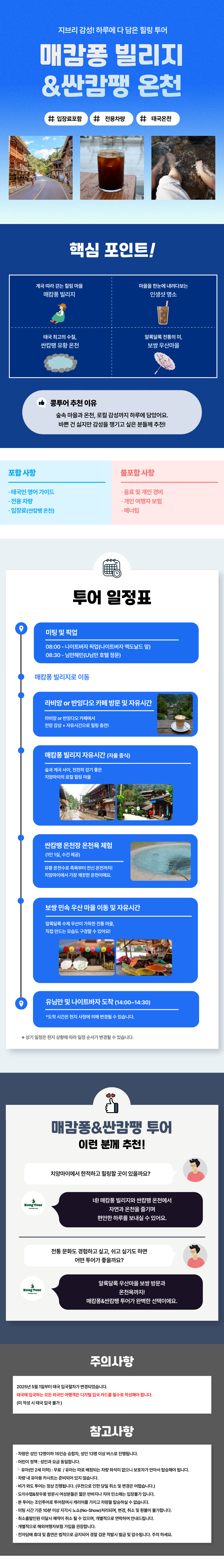 • 차량은 성인 12명이하 15인승 승합차, 성인 13명 이상 버스로 진행됩니다. • 차량 내 유아용 카시트는 준비되어 있지 않습니다. • 사원 방문시 짧은 반바지/짧은 치마/시스루/민소매 등 노출이 있는 복장은 입장 불가 입니다. • 본 투어는 조인투어로 투어 참여 시 캐리어를 가지고 차량을 탑승하실 수 없습니다. • 개별적으로 해외여행자보험 가입을 권장합니다. • 미팅 시간에 늦으실 경우 노쇼로 처리되며 환불이 불가합니다. • 인원 미달로 행사 진행이 어려운 경우, 이용 4일 전까지 취소 안내를 드리며 전액 환불해드립니다. • 투어 잔금 및 추가 요금은 현장 결제 금액으로, 현지에서 가이드에게 직접 지불해 주세요. • 투어 일정과 시간은 현지 상황에 따라 변경될 수 있습니다. • 날씨 등의 자연재해로 인한 불만족의 경우 취소와 환불이 불가능합니다. • 우천 시 투어는 정상 진행됩니다. 다만, 천재지변 또는 안전 우려 시 당일 아침 취소될 수 있습니다. ※ 전자담배 휴대 및 흡연은 법적으로 금지되어 경찰 검문 적발 시 벌금 및 압수됩니다. 주의 하세요. ※ 투어 취소 상황 발생 시 날짜 변경 또는 취소 안내 후, 취소 요청 시 전액 환불해드립니다. 2025년 5월 1일부터 태국 정부의 정책에 따라, 태국으로 입국하는 모든 외국인은 디지털 입국 카드(TDAC)를 반드시 온라인으로 작성·제출해야 합니다. ✈️ 적용 대상 : 태국에 입국하는 모든 외국인 (단, 태국 단순 경유자 및 국경 패스 이용자 제외) 📄 제출 시 필요한 정보 : 여권 정보, 태국 내 숙소 주소, 항공편 정보, 최근 방문 국가, 연락처, 간단한 건강 상태 등 ⚠️ 유의사항 : 미제출 시 입국이 지연되거나 거부될 수 있습니다. 📞기타 비상상황 발생 시 비상 연락망으로 연락 주세요. - 치앙마이 카카오톡 ID : 콩라운지 치앙마이