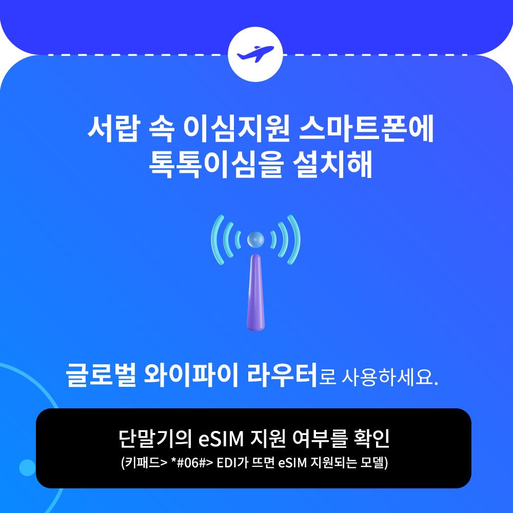 • 톡톡이심의 eSIM을 사용하여 언제 어디서나 빠르고 안전하게 인터넷을 사용할 수 있습니다.