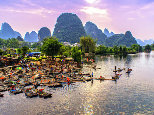 위룽허 관광지 🛶 위룽허는 양숴 지역 내에서 가장 아름다운 리강의 지류로, '소리강'이라고도 불립니다. 뗏목을 타고 래프팅을 하는 것이 가장 핵심적인 코스이며, 푸리교에서 궁농교까지 20개 이상의 댐이 있어 '댐마다 다른 풍경'을 경험할 수 있습니다. 강물은 맑고 투명하며, 양쪽 기슭은 전형적인 카르스트 봉우리와 소박한 마을로 이루어져 있습니다.