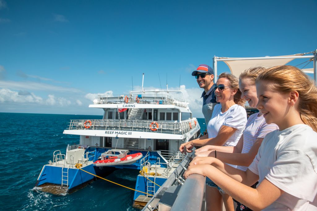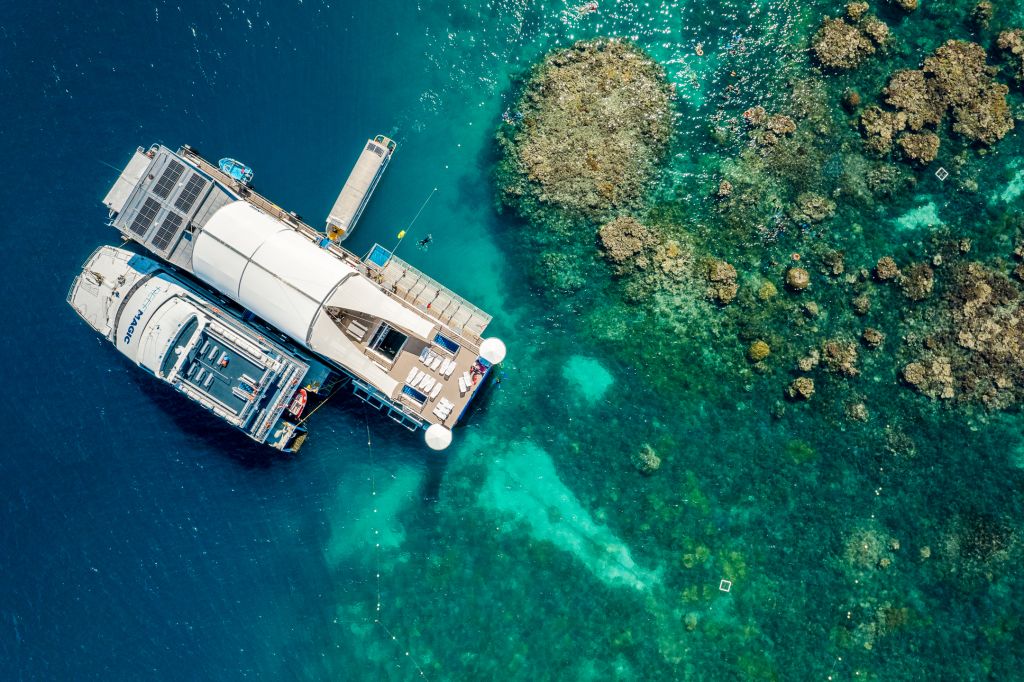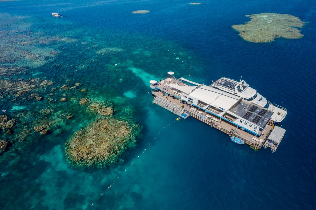 리프 매직 크루즈 호를 타고 맑은 바다, 산호 및 해양 생물들을 구경할 수 있는 산호초에 접근 가능한 리프 매직 폰툰(부유식 해양 체험 공간)에서, 그레이트 배리어 리프의 아름다움을 직접 체험해보세요. 폰툰 도착 후 수중 관측, 물고기 먹이주기 등을 체험해 볼 수 있으며, 산호초 사이를 통과해 폰툰으로 향하는 중 해양 생물 학자의 설명을 들으면서 이 독특한 지역과 바닷속 생물들에 대해서 더 자세히 알아볼 수도 있습니다.