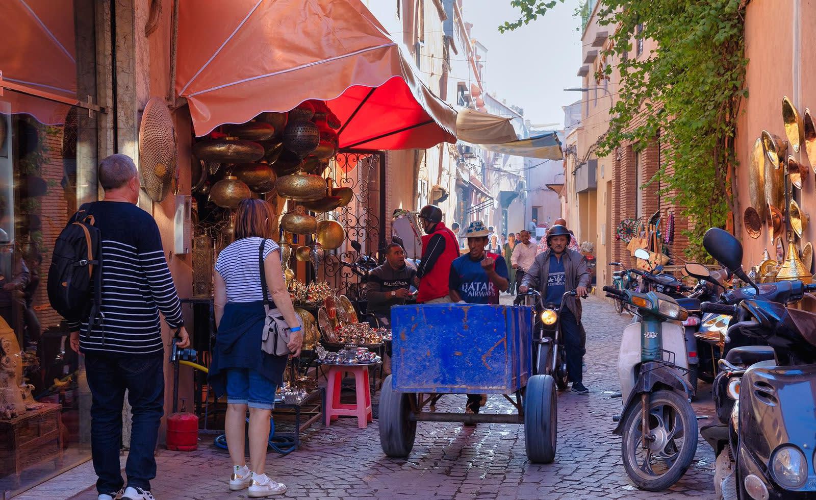 마라케시 (Marrakech) 구시가지인 메디나의 미로 같은 골목길을 누비며 특별한 쇼핑 투어를 떠나보세요. 전통과 생동감 넘치는 문화가 어우러진 세계로 발을 들여놓으면, 발길 닿는 곳마다 새로운 발견이 기다립니다. 활기 넘치는 수크 (Souks)의 북적이는 분위기에 흠뻑 빠져 현지 장인들이 손으로 짠 카펫, 정교하게 제작된 가죽 제품, 반짝이는 램프, 정교한 보석 등 최고의 작품을 선보이는 모습을 감상해 보세요.