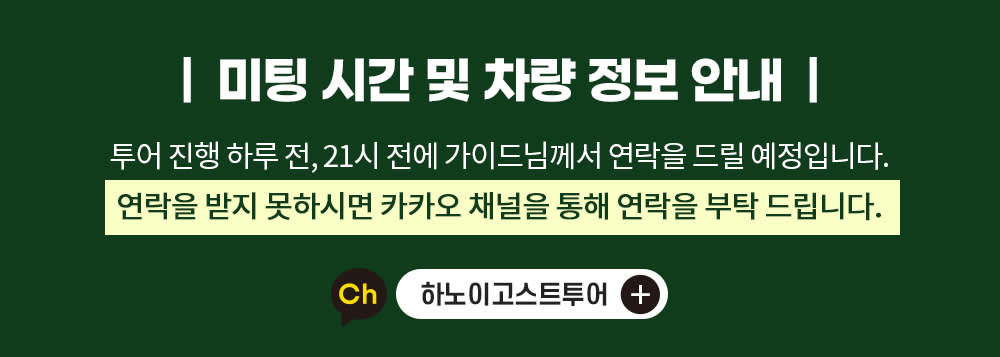 http://pf.kakao.com/_KRKgb/chat - 예약 접수 후, 위 카카오 채널 추가하여 여행자명과 상품명 아래와 같이 남겨 주시기 바랍니다. - 트리플을 통해 하노이 ooo 투어 예약한 000 입니다.