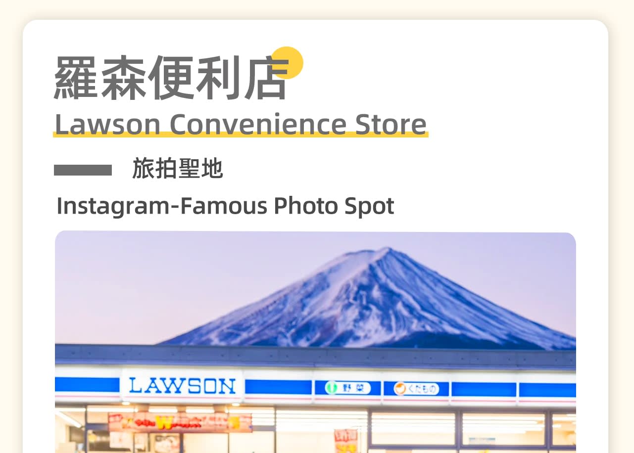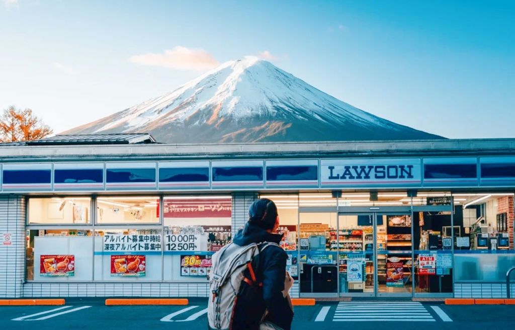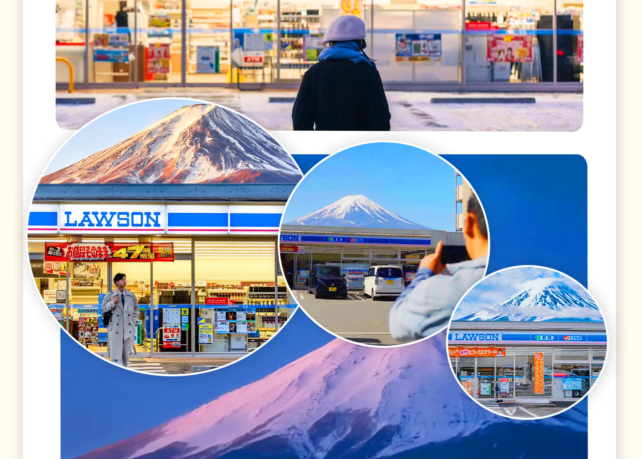 * 네 번째 코스: 📸로손 편의점–여행 사진 명소🏰, 사람과 편의점과 후지산 설경이 함께 어우러져 한 폭의 클래식한 그림을 구성합니다.