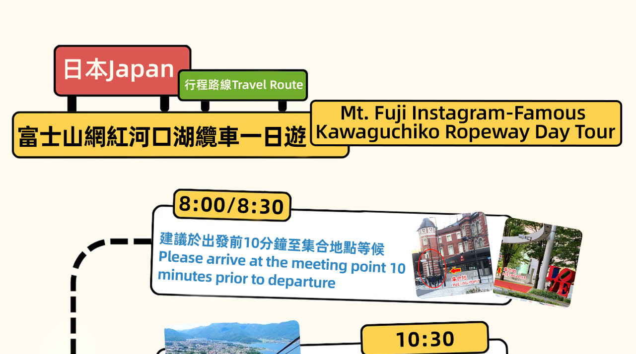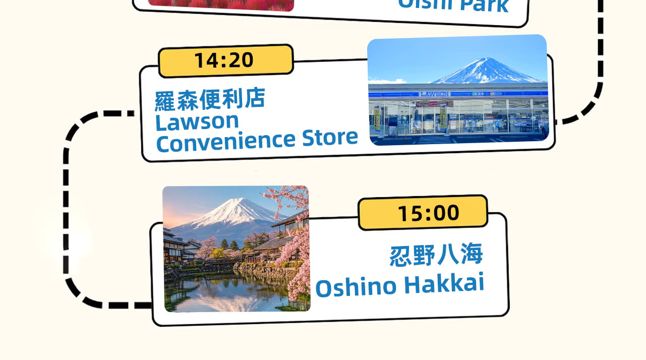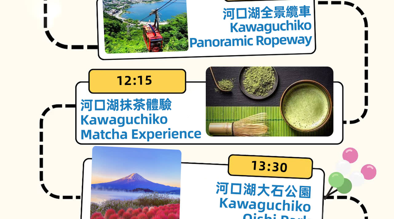 * 🌸오늘 저희는 총 5개의 관광지/체험 활동을 방문할 예정입니다. 가와구치코 인기 파노라마 가치카치산 로프웨이---가와구치코 말차 체험---가와구치코 오이시 공원---로손 편의점---오시노핫카이까지, 알찬 여정, 지금부터 시작합니다🌸