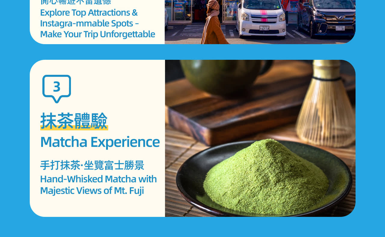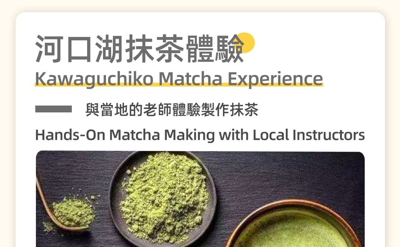 * 두 번째 코스: 가와구치코 말차 체험, 가와구치코는 후지 5호 중 가장 긴 호안선을 가진 호수로, 후지 5호 중 하나입니다. 봄의 벚꽃, 여름의 튤립, 가을의 단풍은 이곳을 계절에 따라 다양한 풍모로 변화시킵니다. 여기에 말차 체험을 추가하여 현지 선생님과 함께 말차를 만들고, 한 잔 마시며 진정한 일본 문화를 체험해보세요.