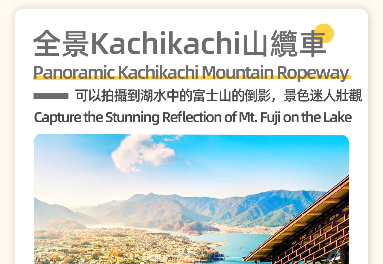* 첫 번째 코스: 가치카치산 로프웨이 또는 텐세이고 전국무장 분위기 배를 타고 가와구치코 호반의 가치카치산 로프웨이를 타고 아름다운 풍경을 감상하세요. 강풍, 낙뢰 등의 원인으로 케이블카 운행이 중단될 수 있습니다. (이는 서비스 품목이며, 날씨로 인해 케이블카를 탈 수 없는 경우 가와구치코 호반 전국무장선으로 변경되거나 티켓 요금이 환불됩니다.)