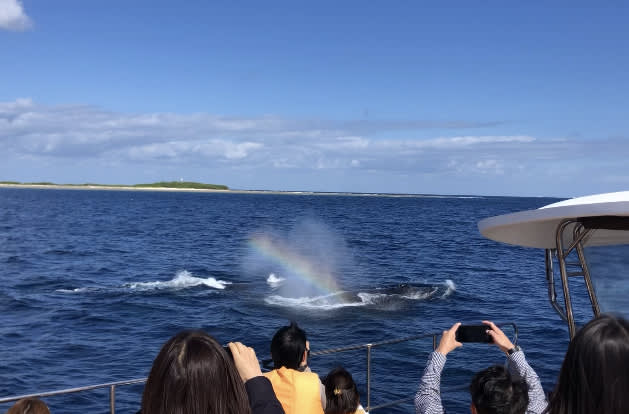 저희 고래 관찰 투어에서 볼 수 있는 혹등고래는 길이가 13~15미터이고 무게는 약 30톤입니다. 12월경부터 짝짓기, 출산, 새끼 양육을 위해 따뜻하고 잔잔한 오키나와 바다로 남하합니다. 투어에서는 어미와 새끼가 평화롭게 헤엄치는 모습, 가끔 거대한 몸이 물 밖으로 솟구쳐 오르는 역동적인 행동을 즐길 수 있습니다. 항상 화려한 액션이 보장되는 것은 아니지만, 자연 속에서 살아가는 이 야생 동물의 웅장한 존재는 감동적이고 잊을 수 없는 경험을 선사할 것입니다.