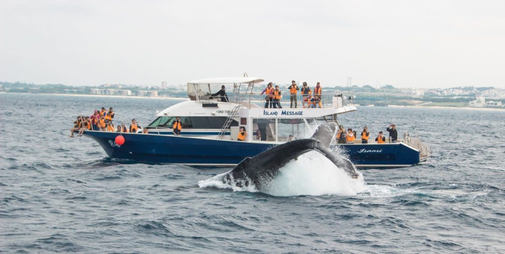 겨울 오키나와에서만 볼 수 있는 혹등고래를 보러 가세요! 저희 보트는 오키나와에서 가장 큰 보트 중 하나이며, 아메리칸 빌리지 근처 차탄의 하마가와 어항에서 출발합니다.