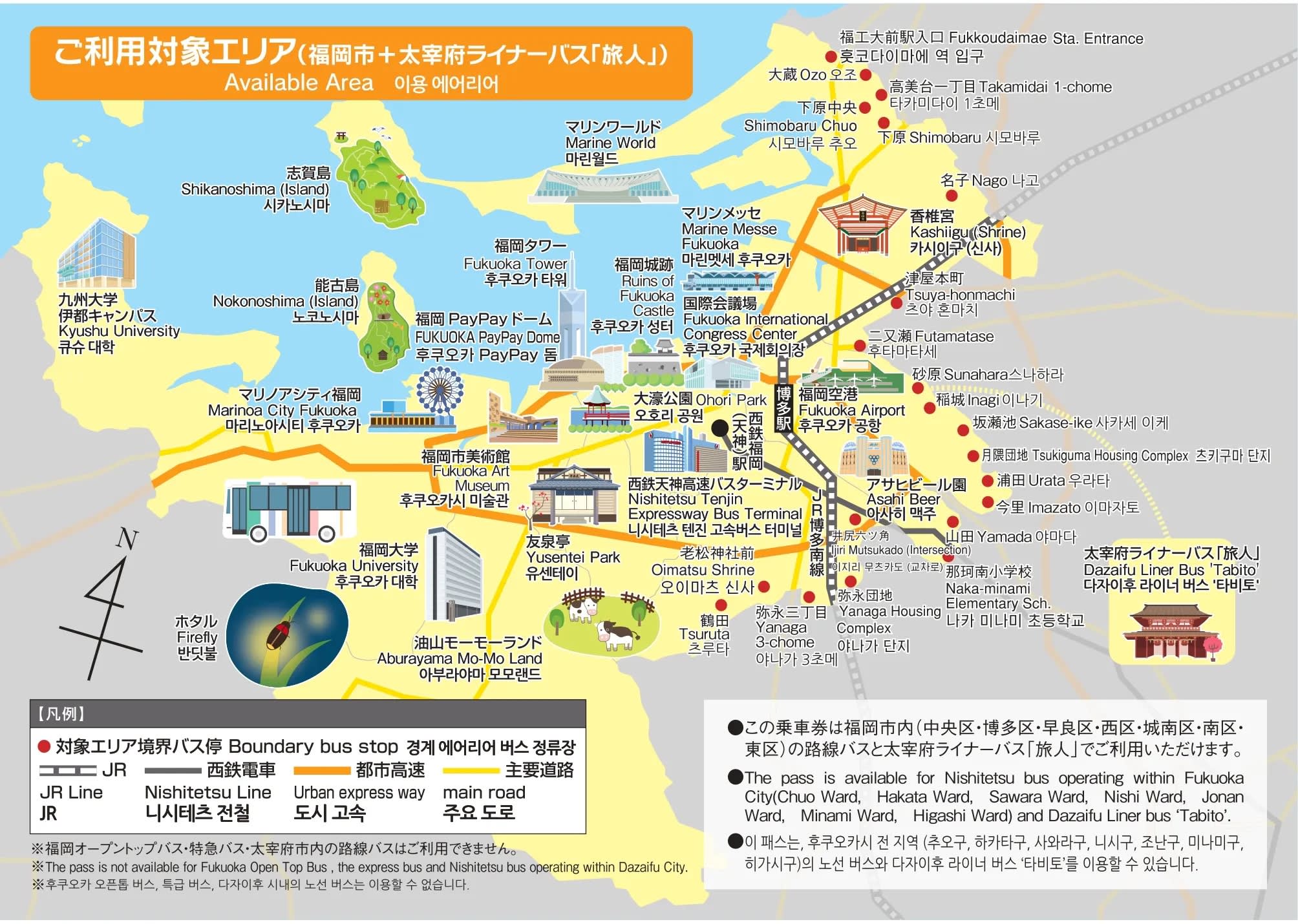 이 티켓으로 후쿠오카 시내 노선 버스를 하루 동안 원하는 만큼 자유롭게 승하차할 수 있습니다. 티켓을 사용하려면 버스 탑승 시 번호표를 뽑고 하차 시 요금함에 넣어주세요. 또한, 스마트폰으로 티켓 화면을 운전기사에게 보여주는 것을 잊지 마세요. 추가로, 티켓 한 장당 초등학생 아동 한 명은 무료로 탑승할 수 있습니다! 이 티켓은 관광, 쇼핑, 통근 목적으로 사용할 수 있습니다.
