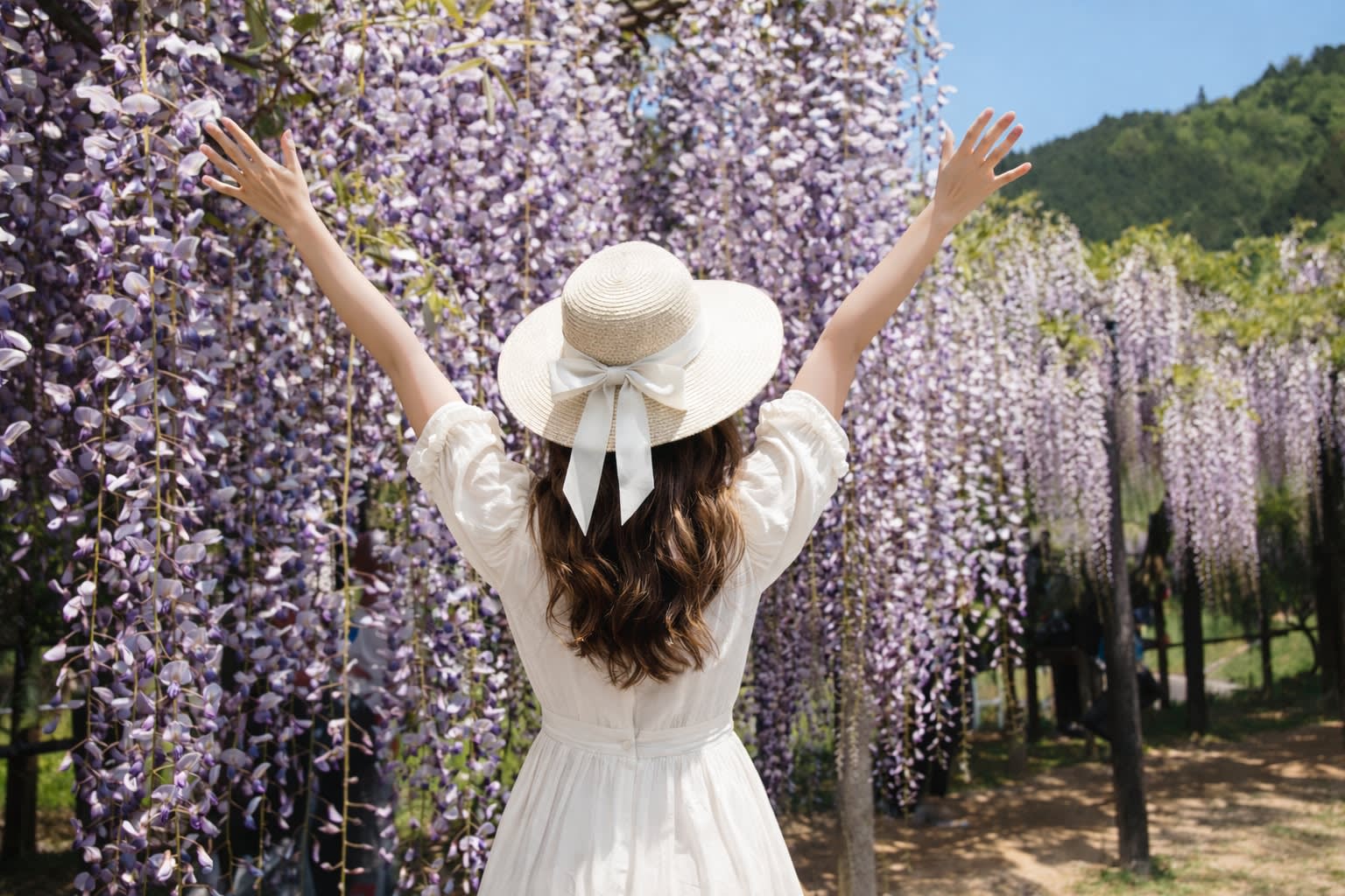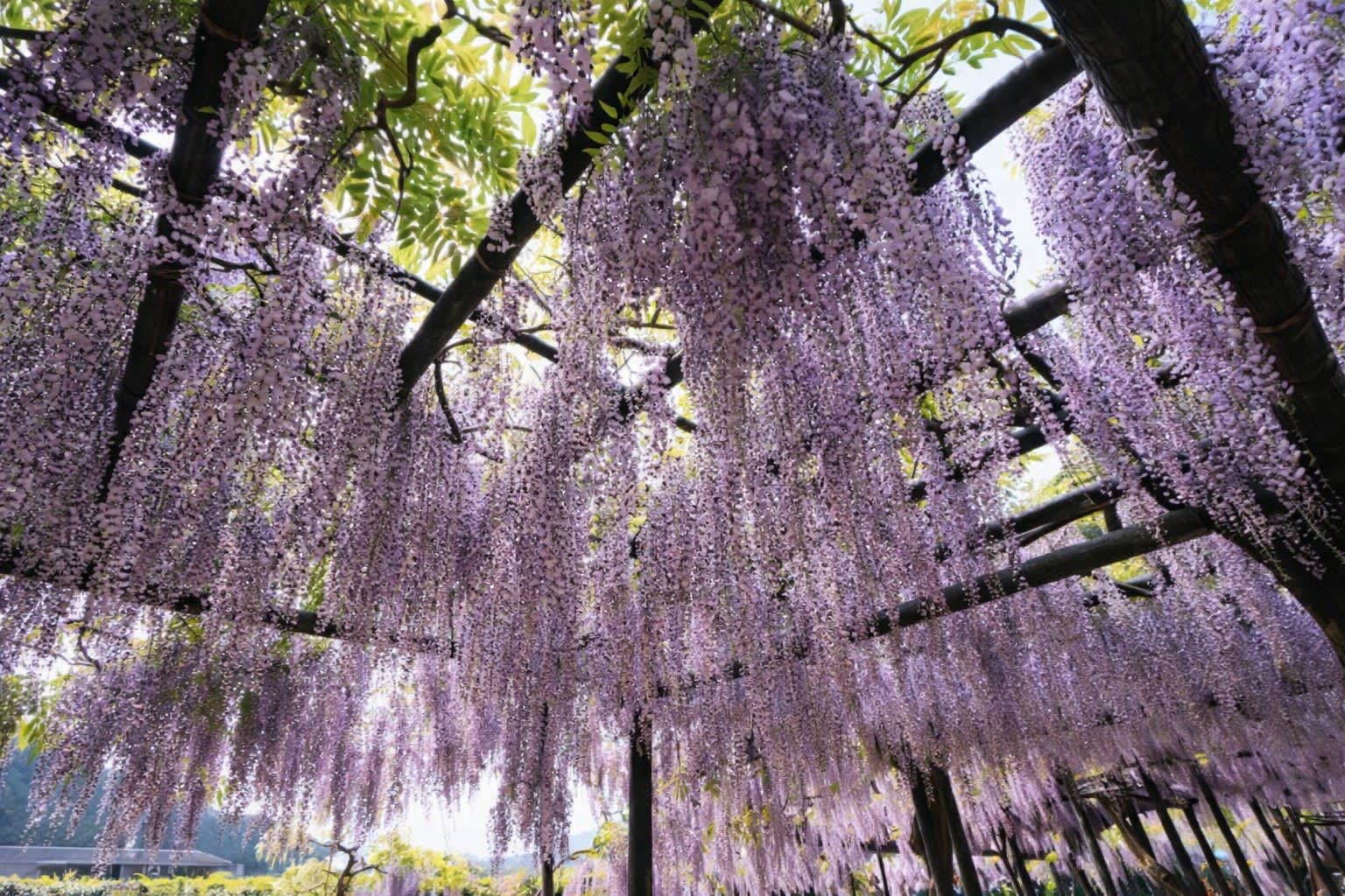 * 시라이 오마치 후지 공원: 폭포처럼 쏟아지는 보라색 기적, 총 길이 500미터, 폭 4미터의 장관을 이루는 등나무 덩굴 선반