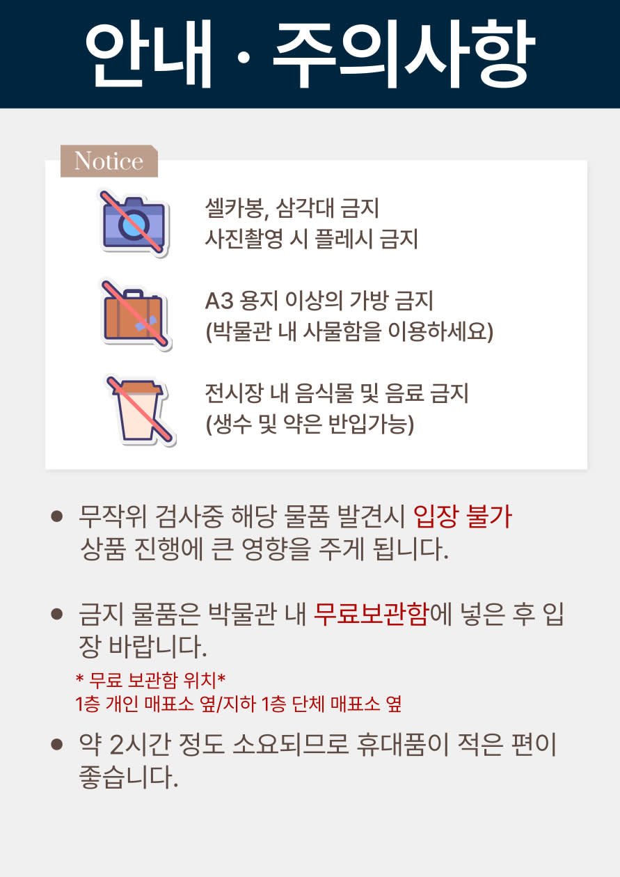 ▶[10시 출발] 한국어 도슨트 투어 - 이용요건 * 본 상품은 이용 가능 연령이 제한되어 있지 않습니다. * 만 0-7세는 무료입니다. - 추가정보 - 편의성/접근성 * 유모차 및 휠체어 이용이 가능합니다. * 장애인 이용 가능 시설에 관한 더 자세한 정보는 공식 웹사이트를 참조해주세요.