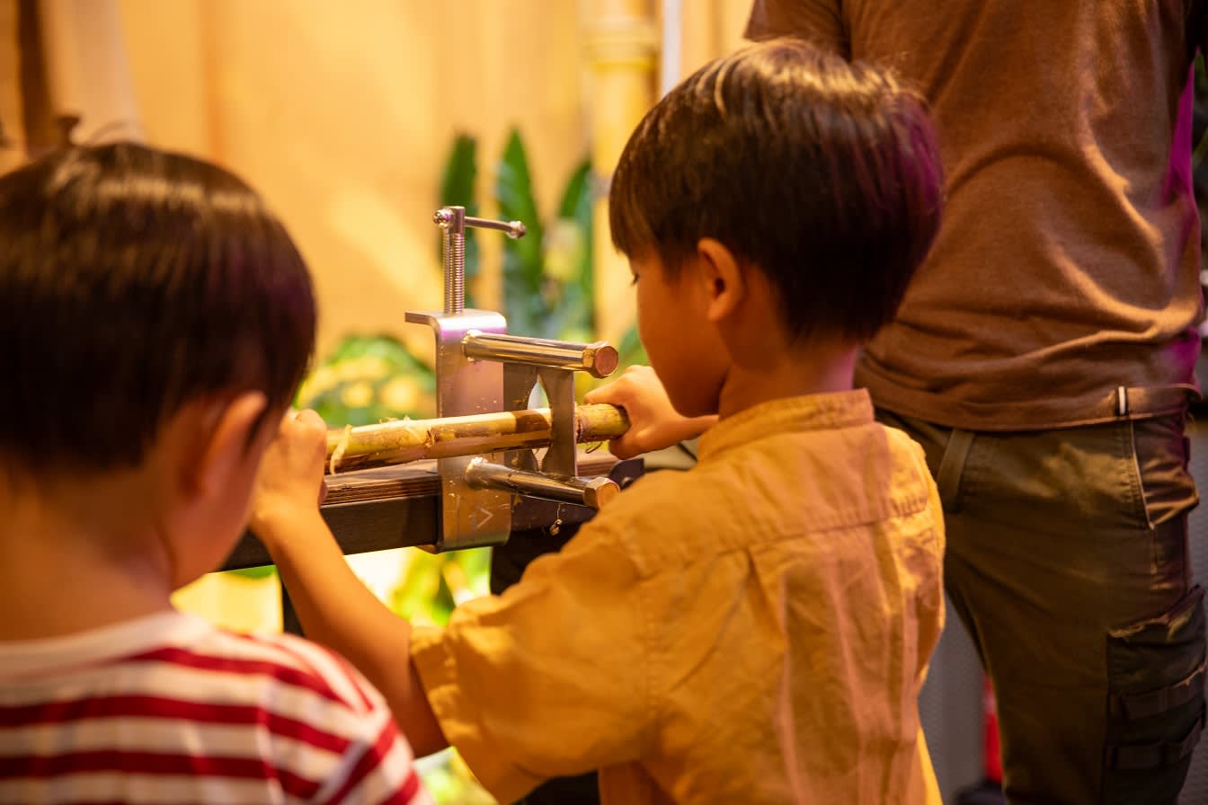 * 사탕수수를 잘라 실제 제분기로 시원한 간식을 만들어 보세요!