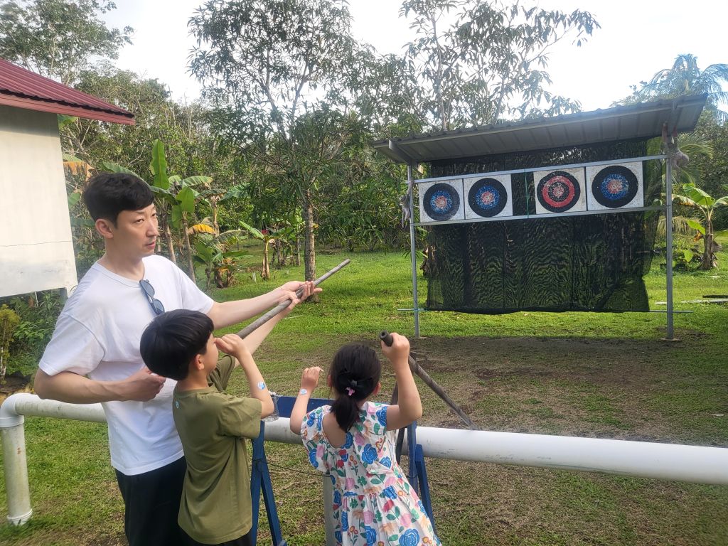 말레이시아 원주민이 사냥에 사용하던 전통 도구로, 긴 관에 숨을 불어 화살을 날리는 방식의 체험입니다.