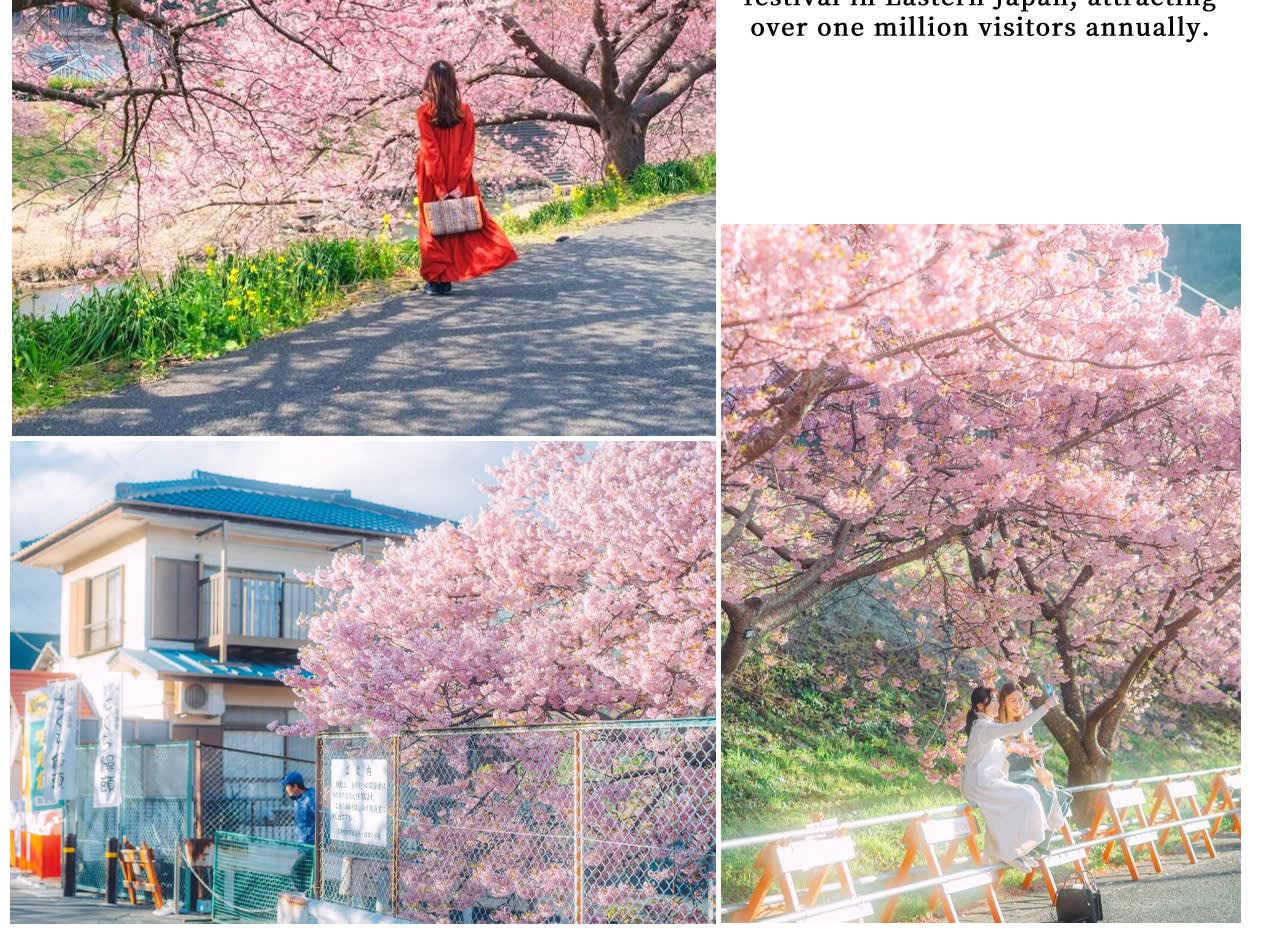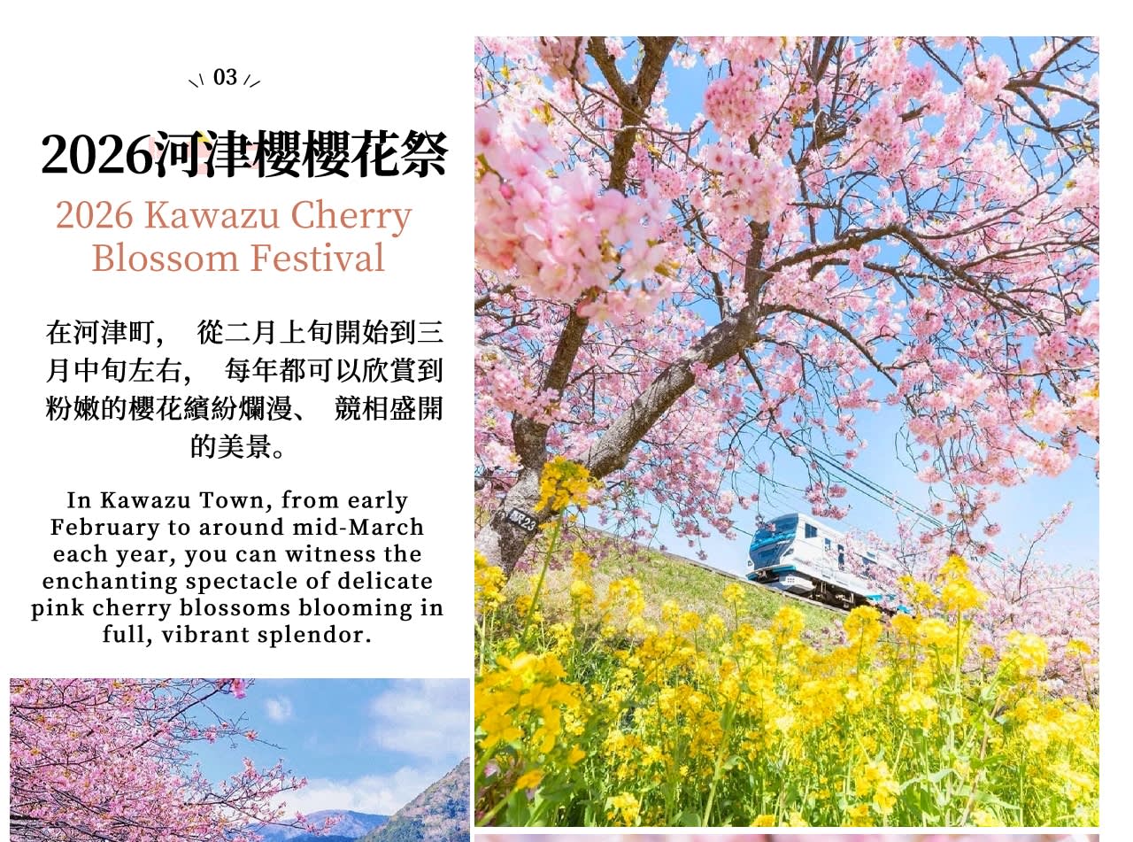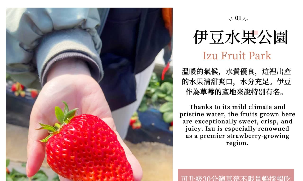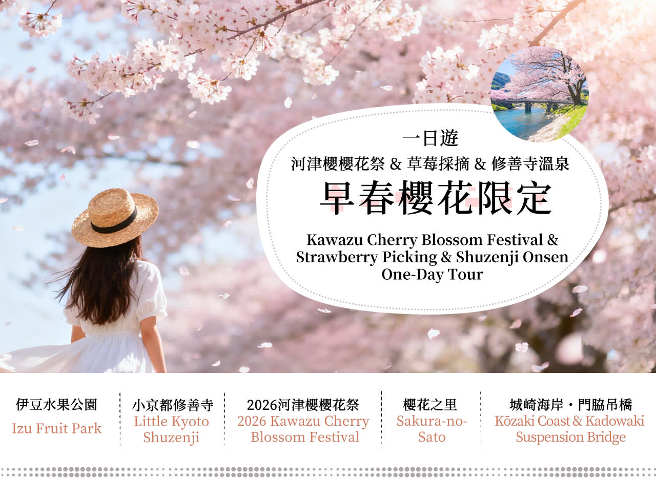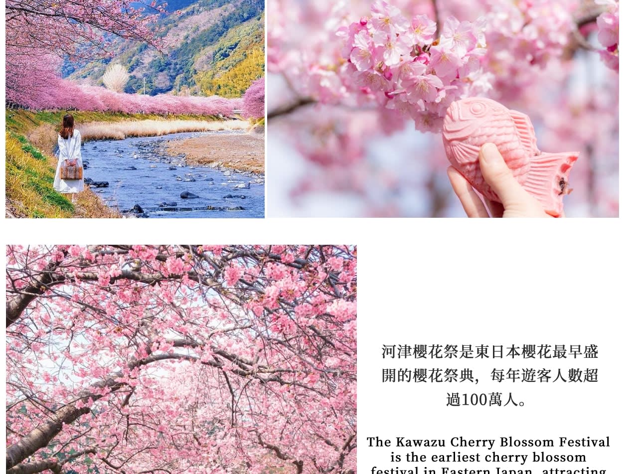 * 이른 봄 한정 가와즈 벚꽃: 개화 시기가 빠르고 분홍색이 짙어 이즈 가와즈에서 일본에서 가장 먼저 피는 벚꽃을 가장 먼저 감상하세요!\n\n* 낭만적인 벚꽃길: 강 양쪽 4km에 걸쳐 펼쳐진 분홍빛 꽃바다에서 봄의 첫 아름다운 사진을 찍어보세요.\n\n* 신선하고 즙이 많은 딸기 따기: 온실에 들어가 직접 갓 딴 딸기를 따고, 일본 딸기의 단맛은 만점이며, 어른과 아이 모두 좋아합니다.\n\n* 슈젠지 온천에서 심신을 편안하게 하세요: 이즈에서 가장 유서 깊은 온천 마을을 방문하여 온천 거리를 거닐고 일본식 풍취와 고풍스럽고 조용한 분위기를 느껴보세요.\n\n* 3/9부터 조가사키 해안 & 가도와키 현수교 추가 증정: 절벽 해안선과 푸른 바다를 감상하고, 멋진 바다 전망 현수교를 걸으며 이즈에서 가장 아름다운 바다를 즐겨보세요