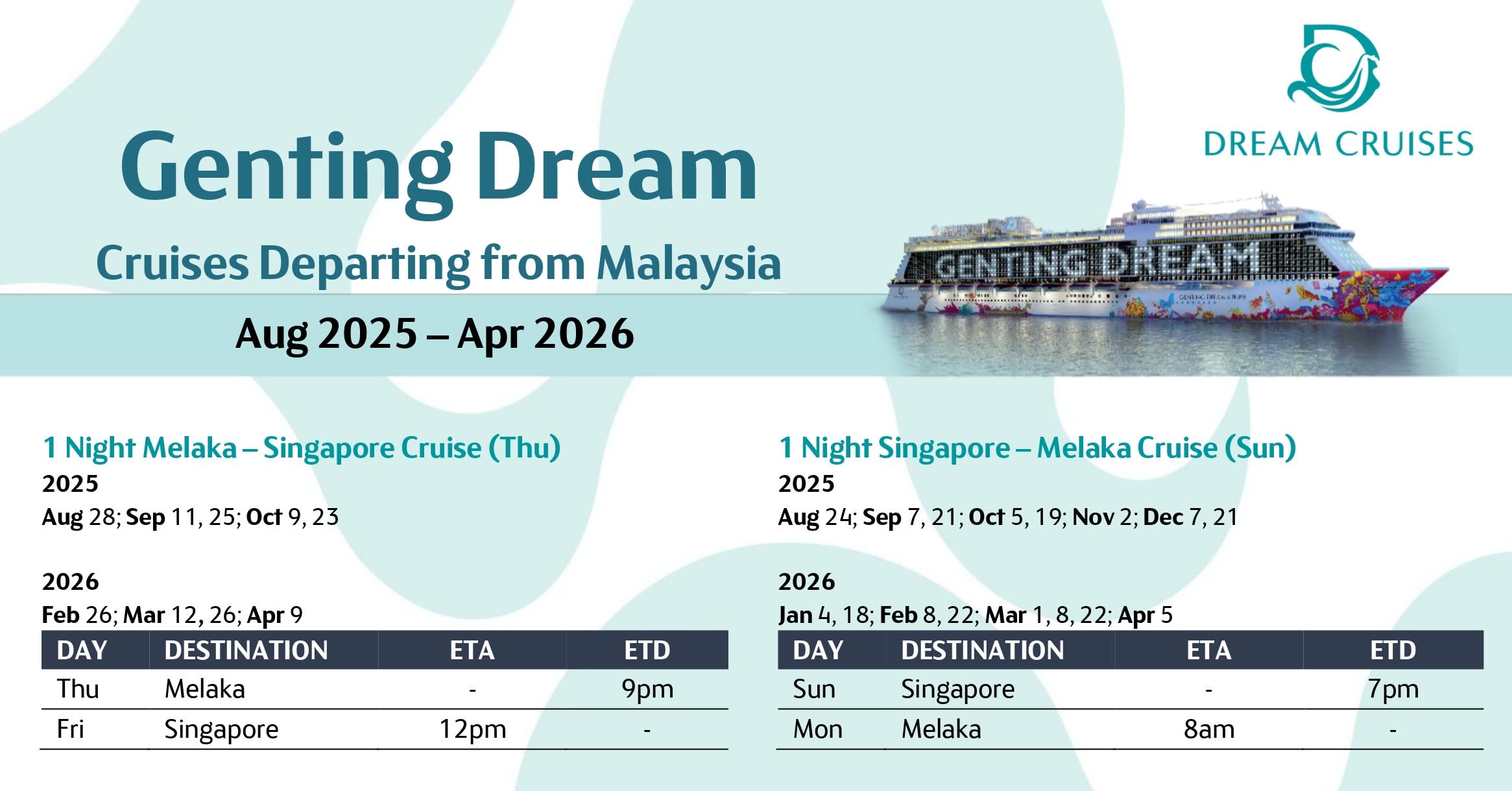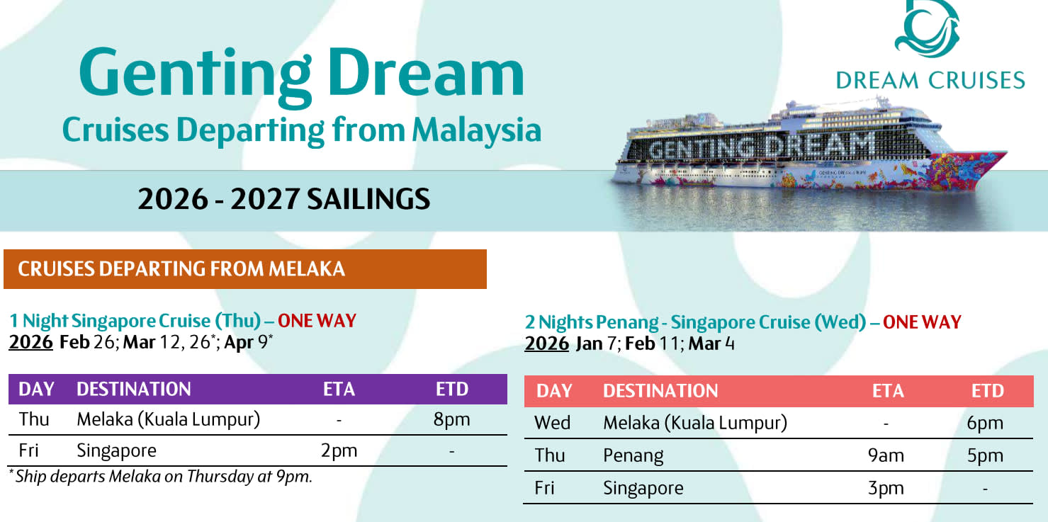 - 겐팅 드림호 브로슈어 - 싱가포르 크루즈 선사 이 싱가포르 크루즈 여행을 제공하는 크루즈 선사는 스타드림 크루즈입니다. 겐팅 드림 크루즈 선박에 탑승하여 최고의 바다 휴가를 즐기실 수 있습니다. - 독특한 동남아시아 크루즈 여행 2일간의 독특한 여정이 다양하게 준비되어 있으며, 마리나 베이 크루즈 센터 또는 포트 클랑에서 출항하여 쿠알라룸푸르, 말라카 또는 싱가포르에 정박합니다. - 선내 시설 및 활동 겐팅 드림 크루즈 선박은 워터슬라이드 공원, 고공 장애물 코스 및 짚라인, 스파, 조디악 극장 쇼, 특별 이벤트 라이브 음악 등 다양한 선내 시설과 경험을 제공합니다. 를 확인하세요! - 선내 레스토랑 고급 일식 요리부터 야외 핫팟 레스토랑까지 다양한 전문 레스토랑이 있습니다. 또한 다양한 목적지에서 육상 투어도 제공되니, 매진되기 전에 에서 예약하세요! - 할랄 스타드림 크루즈는 싱가포르에서 개최된 2023 할랄 인 트래블 어워드에서 '올해의 무슬림 친화 크루즈 선사'로 선정되었습니다. 겐팅 드림호는 2022년 6월부터 세계 최초의 OIC/SMIIC* 표준 할랄 친화 크루즈 선박으로 운영되어 왔으며, 무슬림 승객들에게 총체적인 할랄 친화 크루즈 경험을 제공하는 이 지역 유일의 크루즈 선박입니다. - 이용 가능한 객실 카테고리 이 크루즈 선박에는 예산 친화적인 내측 객실, 오션뷰, 넓은 발코니 객실, 팰리스 스위트 등 4가지 주요 카테고리가 제공됩니다. - 성수기 성수기 예약은 100% 확정됩니다. 취소는 허용되지 않습니다. 성수기 출항: 2026년 2월 17일 - 여행자 보험 크루즈를 예약하신 경우 여행자 보험 가입을 적극 권장합니다. 이는 의료상의 이유로 인한 크루즈 취소에 대비하여 보장해 드립니다. - 입국 심사 요건 입국 심사 요건에 유의하시기 바랍니다. 외국인 승객은 방문할 국가에 따라 비자 요건을 스스로 확인해야 합니다. 승객은 여행 서류에 대한 가장 정확하고 최신 정보를 얻기 위해 해당 국가의 공식 웹사이트를 참조하는 것이 좋습니다. - 싱가포르 비자 요건: * 유효기간이 6개월 이상 남은 여권 * 싱가포르 도착 전 SG Arrival Card를 에서 온라인으로 제출하세요. * 확정된 크루즈 티켓 * 아프리카, 남미의 영향을 받은 국가에서 도착하는 경우 황열병 예방접종 증명서 - 말레이시아 비자 요건 * Shorex 이용 시 비자 불필요 (이스라엘 시민 제외) * 이스라엘 시민은 상륙 불가 - 태국 비자 요건 * 도착 비자 및 입국 심사 수수료는 총 108SGD입니다. * 태국 도착 3일 이내에 태국 디지털 도착 카드(TDAC)를 에서 온라인으로 제출하세요. - 팁 팁은 선박 내에서 지불해야 합니다. * 내측 객실에서 오션뷰까지 팁: 1인당 1박에 27SGD * 발코니 객실 팁: 1인당 1박에 33SGD * 팰리스 스위트에서 팰리스 빌라까지 팁: 1인당 1박에 40SGD - 표시된 가격 * 표시된 모든 가격은 할인 후 가격입니다. * 요금은 유동적이며, 예약이 즉시 확정되지 않을 경우 가격 변동이 있을 수 있습니다. * 한 객실에 탑승하는 총 승객 수를 선택해 주세요. - 체크인 * 객실 번호와 객실 키 카드는 카운터에서만 받을 수 있습니다. * 게이트 마감 시간, 체크인 시간 및 선박 하선 시간에 유의해 주세요.