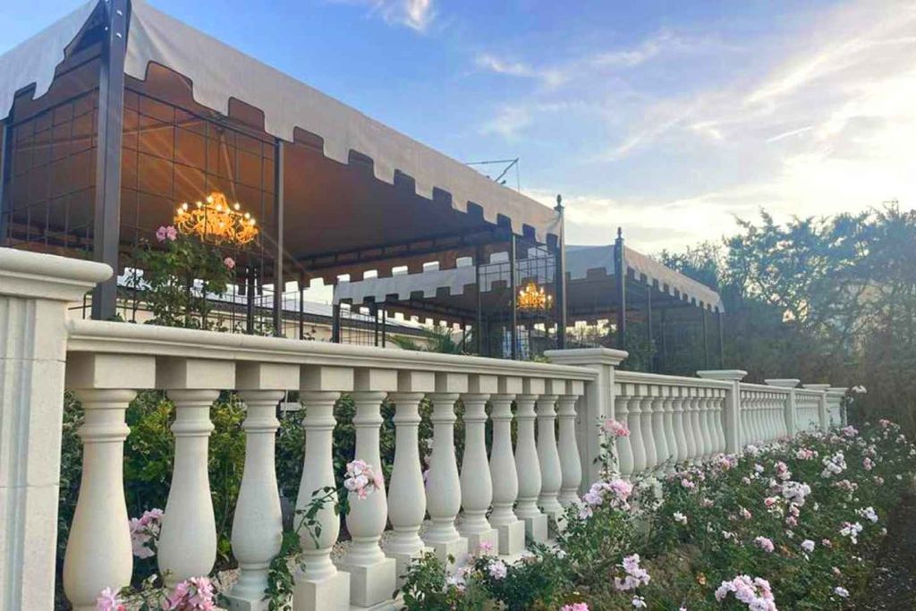 연중무휴로 운영되는 테라스는 지붕이 있는 야외 점심 식사를 제공합니다.