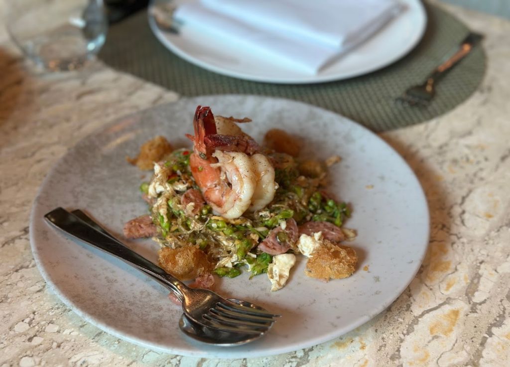 쁠라 끄라퐁 소스 마 캄 [농어, 타마린 소스, 크리스피 샬롯, 자스민밥]