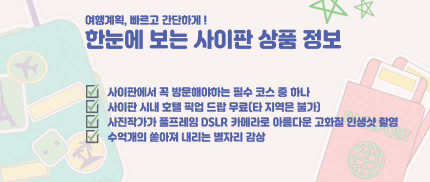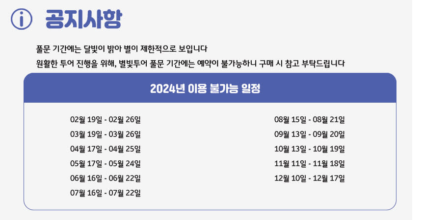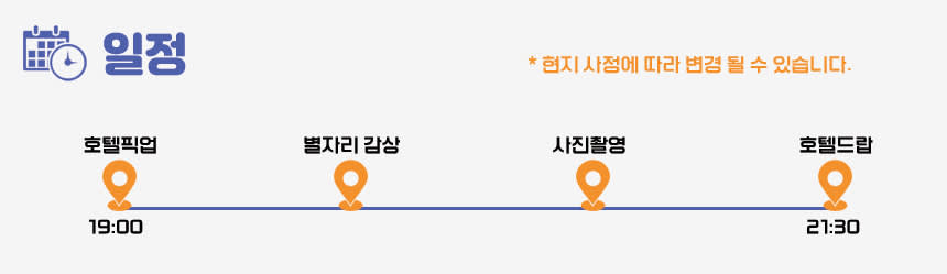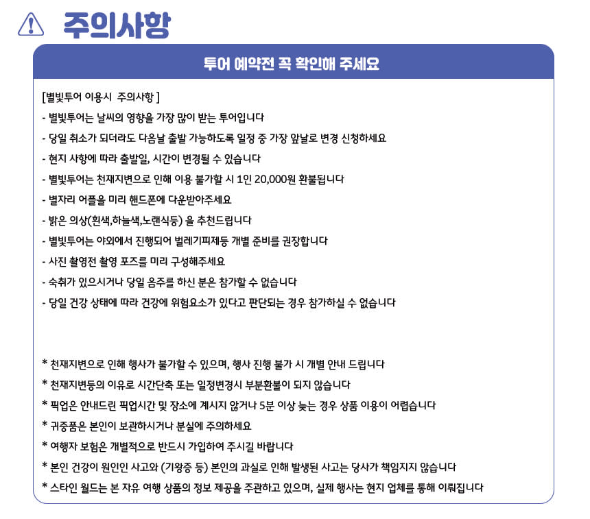 [포함사항] · 왕복 호텔 픽·드랍 서비스 · 별사진 3매 [불포함사항] · 개인 경비 · 매너 팁 (매너 팁은 권장사항으로 투어 종료 후 지불해주시면 되십니다.) 📢 [안내 사항] - 별빛 투어는 날씨의 영향을 가장 많이 받는 투어입니다. 당일 취소가 되더라도 다음날 출발 가능하도록 일정 중 가장 앞날로 변경 신청하세요. - 갑작스런 기상악화로 별빛이 잘 보이지 않는 경우 투어 당일 취소될 수 있습니다. ※ 출발 여부는 오후 6시쯤 확정됩니다. - 현지 사항에 따라 취소 또는 출발일, 시간이 변경될 수 있습니다. - 사진 촬영을 위해 밝은 의상을 입어주세요. - 귀중품은 본인이 보관하시거나 분실에 주의하세요. - 천재지변(태풍, 지진 등)으로 인해 행사가 불가할 수 있습니다. - 여행자 보험은 개별적으로 반드시 가입하여 주시길 바랍니다. - 호텔, 리조트, 위치(에어비앤비)등에 따라 픽업이 불가할 수도 있으며 추가요금 발생되는 경우에는 안내 시 별도 안내드립니다. - 스타인월드는 본 자유 여행 상품의 정보 제공을 주관하고 있으며, 실제 행사는 현지 업체를 통해 이뤄집니다.