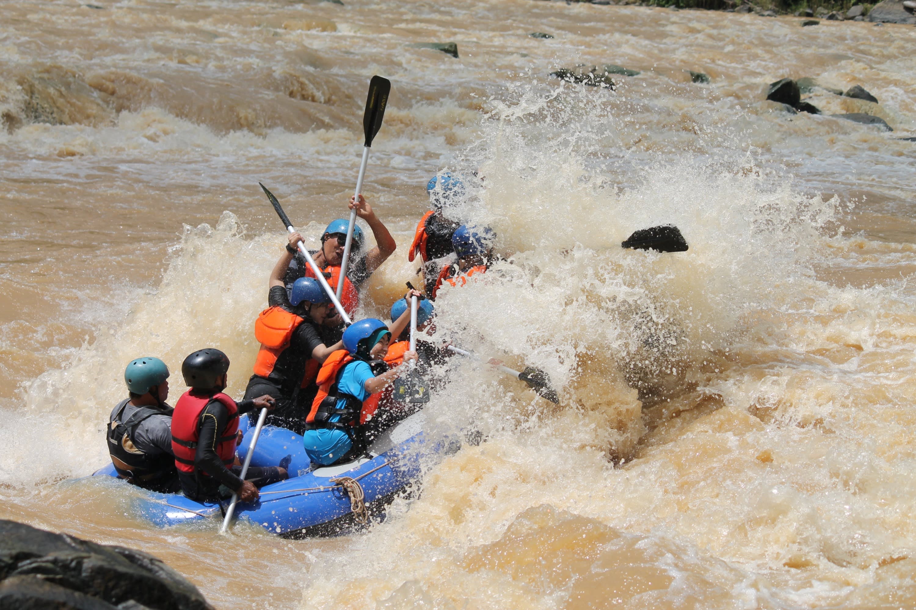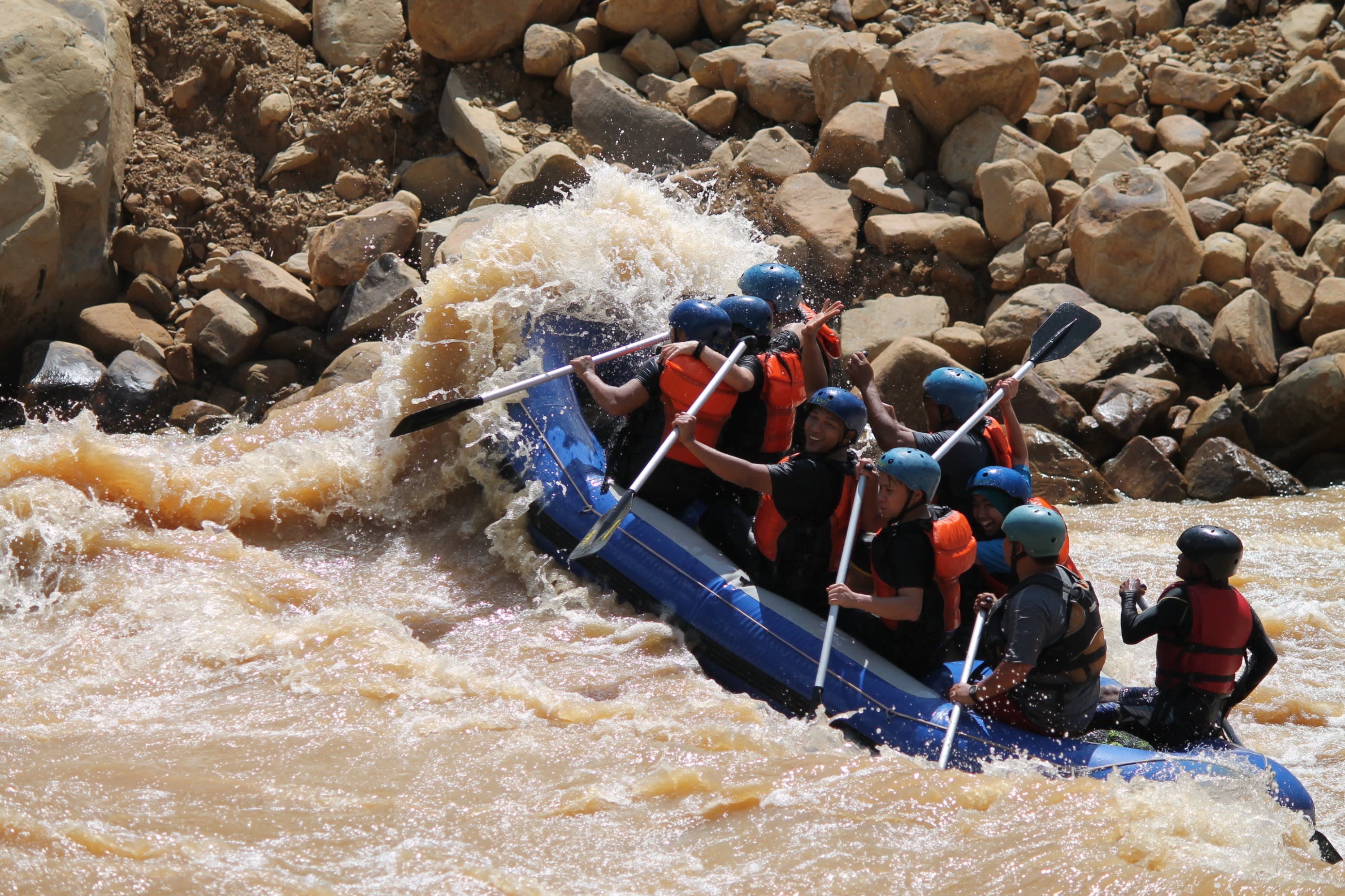* 뗏목에 올라 8개의 급류와 8개의 잔잔한 물길이 있는 12km 강을 따라 노를 저어 보세요.