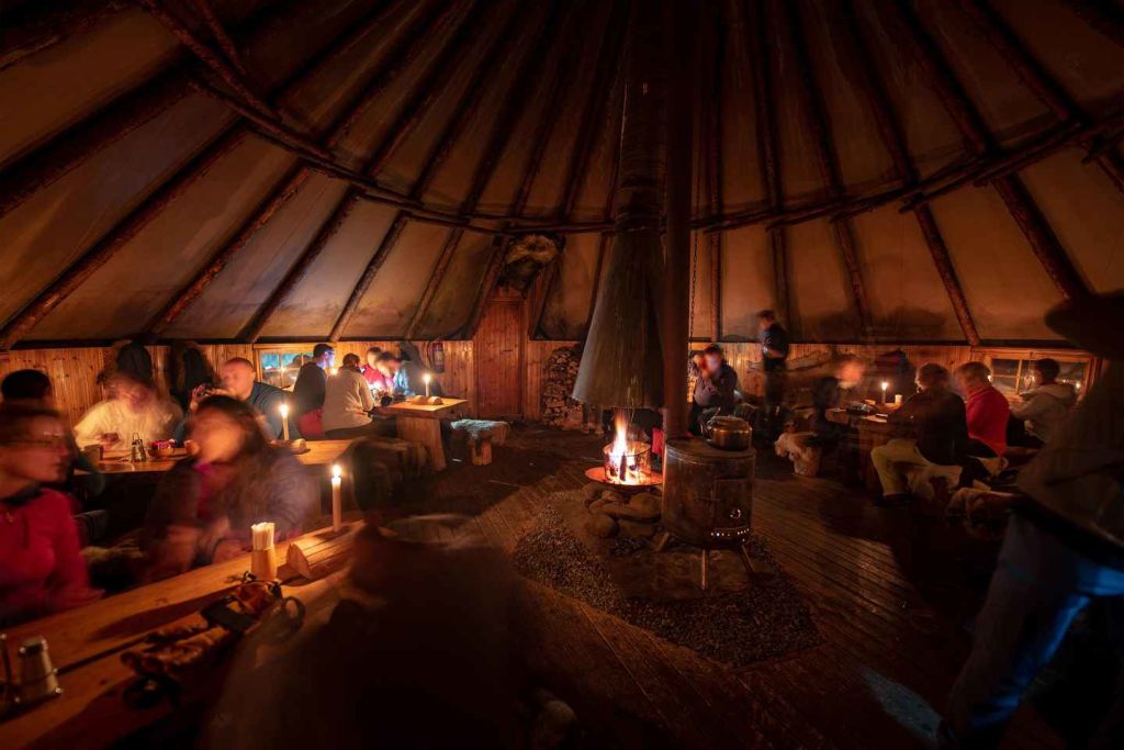 투어가 끝나면 탐옥 야영지로 돌아와 라브부스(사미족 전통 텐트)에서 따뜻한 음식과 음료를 즐기며 휴식을 취하고 몸을 녹일 수 있습니다.