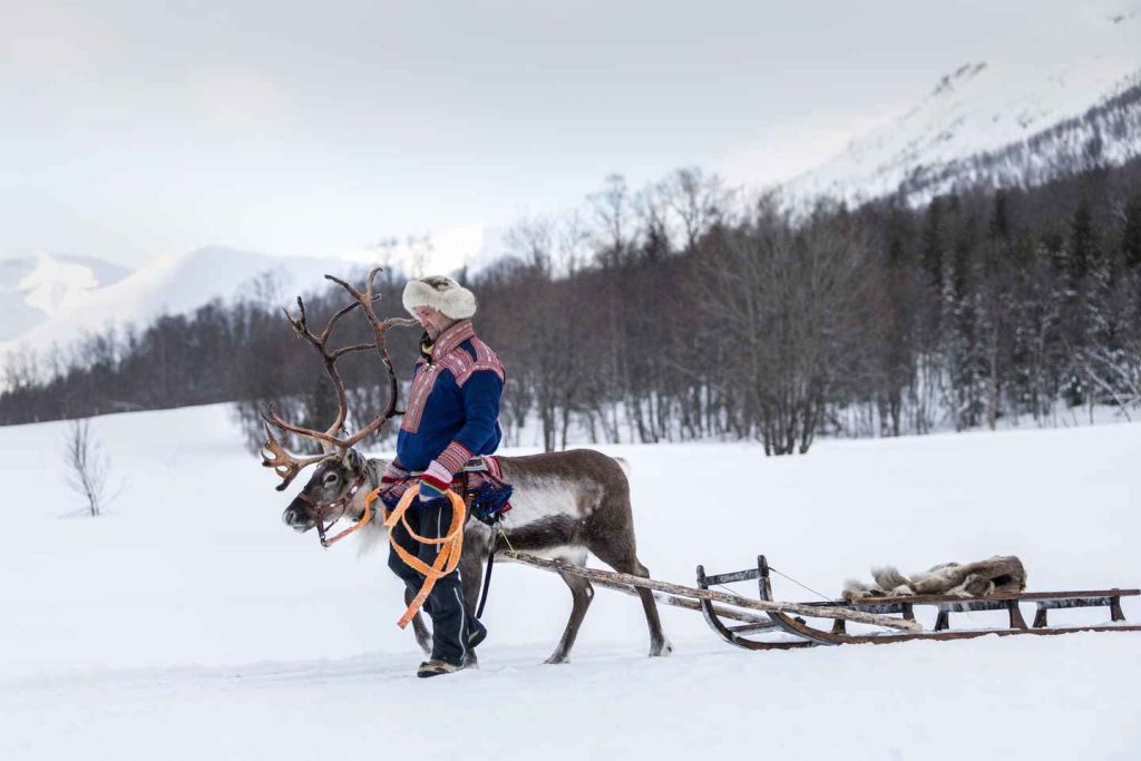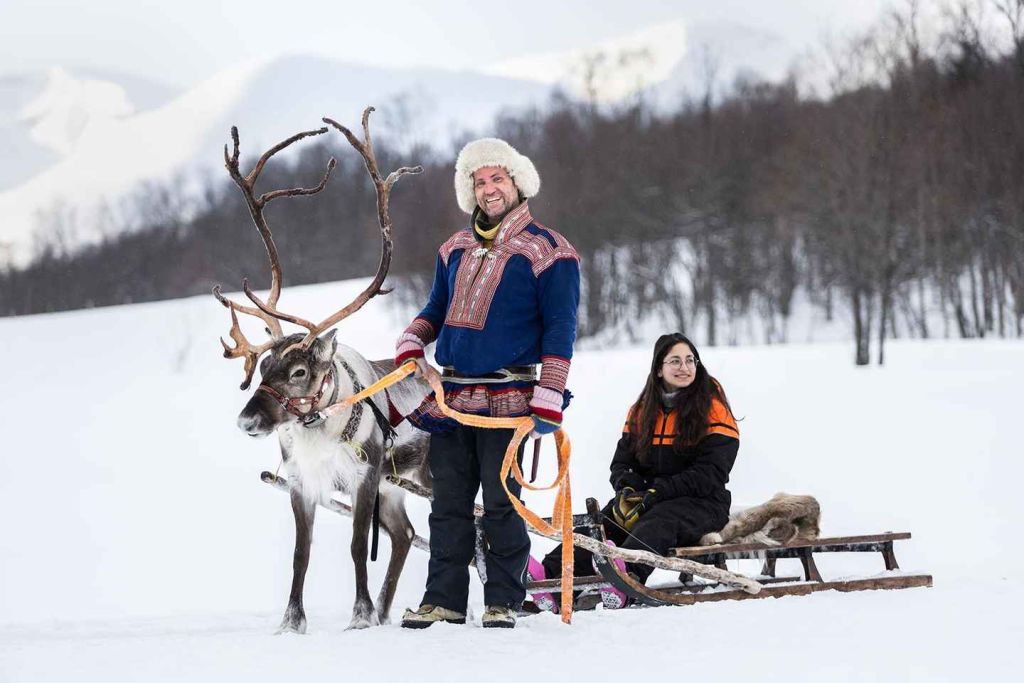 북극의 눈 덮인 풍경을 감상하며 순록 썰매를 타는 짧은 여행을 즐기세요.