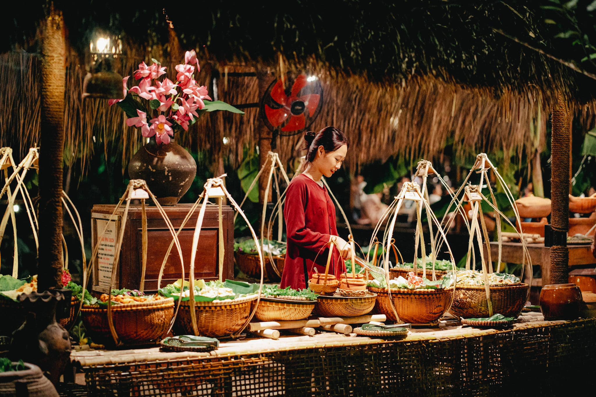 나트랑 중심부에 위치한 Buffet Quê Xưa-Nha Trang Xưa는 아늑하고 소박한 분위기 속에서 베트남 전통 요리를 즐길 수 있는 완벽한 장소입니다. 북부 시골에서 영감을 받은 디자인이 돋보이는 이 레스토랑은 초가지붕, 대나무 장식, 소박한 나무 가구로 따뜻하고 친근한 분위기를 자아냅니다.