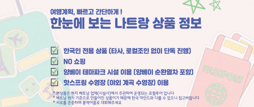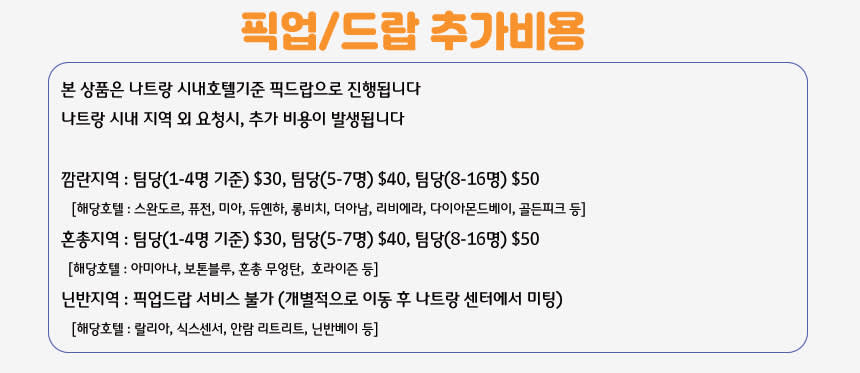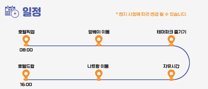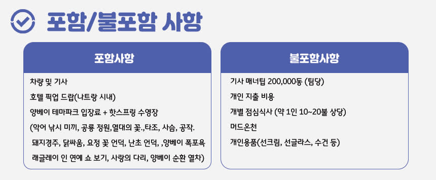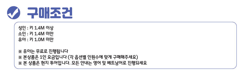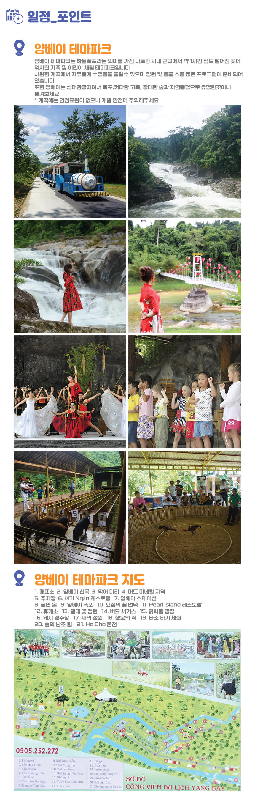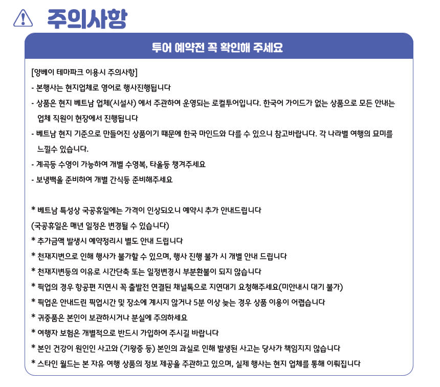 [양베이 테마파크 이용시 주의사항] - 본행사는 현지업체로 영어로 행사진행됩니다 - 상품은 현지 베트남 업체(시설사) 에서 주관하여 운영되는 로컬투어입니다. 한국어 가이드가 없는 상품으로 모든 안내는 업체 직원이 현장에서 진행됩니다 - 베트남 현지 기준으로 만들어진 상품이기 때문에 한국 마인드와 다를 수 있으니 참고바랍니다. 각 나라별 여행의 묘미를 느낄수 있습니다. - 계곡등 수영이 가능하여 개별 수영복, 타올등 챙겨주세요 - 보냉백을 준비하여 개별 간식등 준비해주세요 * 베트남 특성상 국공휴일에는 가격이 인상되오니 예약시 추가 안내드립니다 (국공휴일은 매년 일정은 변경될 수 있습니다) * 추가금액 발생시 예약정리시 별도 안내 드립니다 * 천재지변으로 인해 행사가 불가할 수 있으며, 행사 진행 불가 시 개별 안내 드립니다 * 천재지변등의 이유로 시간단축 또는 일정변경시 부분환불이 되지 않습니다 * 픽업의 경우 항공편 지연시 꼭 출발전 연결된 채널톡으로 지연대기 요청해주세요(미안내시 대기 불가) * 픽업은 안내드린 픽업시간 및 장소에 계시지 않거나 5분 이상 늦는 경우 상품 이용이 어렵습니다 * 귀중품은 본인이 보관하시거나 분실에 주의하세요 * 여행자 보험은 개별적으로 반드시 가입하여 주시길 바랍니다 * 본인 건강이 원인인 사고와 (기왕증 등) 본인의 과실로 인해 발생된 사고는 당사가 책임지지 않습니다 * 스타인 월드는 본 자유 여행 상품의 정보 제공을 주관하고 있으며, 실제 행사는 현지 업체를 통해 이뤄집니다