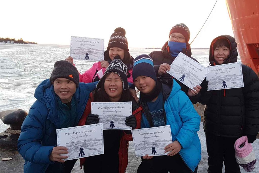 체험이 끝나면 선장이 크루즈 및 수영 인증서를 수여합니다. 크루즈가 끝나면 편안한 셔틀을 타고 로바니에미로 돌아갑니다.
