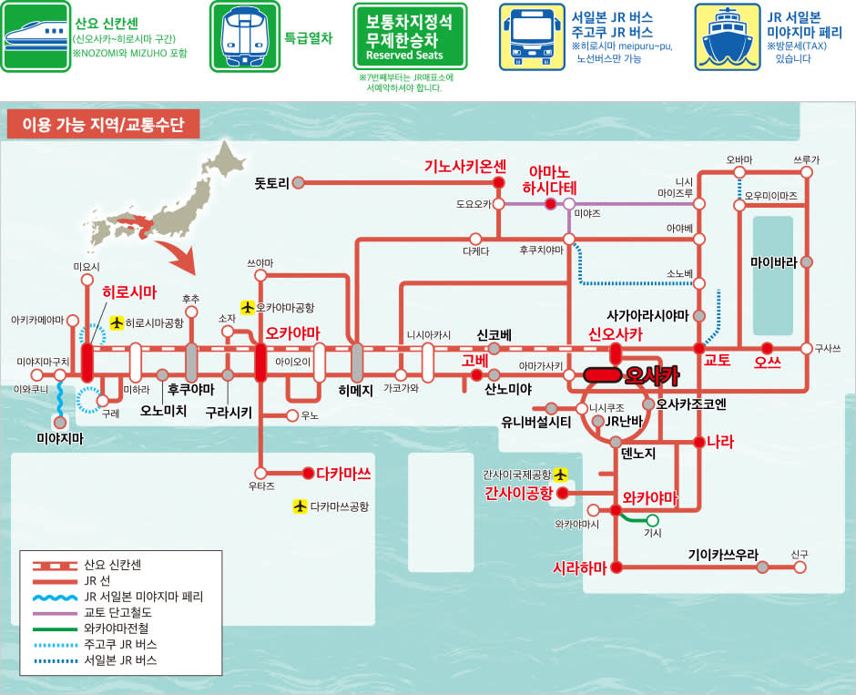 [이용안내] (JR간사이 히로시마 패스) 바우처 유효기간 : 구매일로부터 90일이내 유효 실권의 유효기간 : 교환시 지정한 날로부터 5일간 유효 1. 예약 완료시, 플랫폼에서는 예약하신 손님이 기재하신 이메일주소로 예약 성공된 이메일을 자동으로 보내드립니다. 2. 수령한 인증코드 또는 QR 코드, 그리고 예약하신 분의 여권이 일본국적이 아닌 경우, 아래 안내도에 따라 지정된 역 티켓발권기에서 실물 티켓을 교환하십시오. 역 발권기는 5개 국어 (일본어, 중국어 간체, 중국어 번체, 영어 및 한국어)로 제공됩니다. ※자세한 티켓교환장소는 아래에서 확인해 주세요: https://www.westjr.co.jp/global/kr/ticket/receive/ ※eMCO의 자세한 교환방법은 다음 링크에서 확인해 주세요: https://www.westjr.co.jp/global/kr/howto/guide/emco/ ※티켓 발권기에 결함이 있거나 또는 여권에 IC칩을 추가하지 않은 경우, 지정된 역의 미도리노마도구치로 가서 실물 티켓으로 교환하십시오. 3. 그것으로 티켓를 실권으로 교환완료. 4. 지정석권 교환 : 티켓을 이용할 때, 지정석을 예약할 수 있게 된 티켓은 아래 URL의 방법에 따라 JR역의 발매기에서 지정석을 예약하여 지정석권으로 교환할 수 있습니다. ※자세한 내용은 아래를 참고해 주세요. https://www.westjr.co.jp/global/kr/howto/ticket-vending-machine/ 【JR 서일본 레일 패스 예약 좌석 교환 공지】 1. 지정석으로 횟수제한없이 무제한 이용 가능합니다. 2. 지정석 이용가능한 열차는 각 상품페이지에서 확인해 주세요. 3. 패스의 지정석은 별도 교환이 필요합니다. (녹색 발권기 또는 미도리노마도구치에서 예약) 4. 지정석 교환횟수를 모두 사용하였거나 사전에 지정석으로 교환하지 않은 경우에는 소지하신 패스만으로 자유석을 이용할 수 있습니다. 5. 지정석 교환횟수가 무제한인 패스의 경우, 7번째 교환부터는 미도리노마도구치에서 예약해 주세요. 기계에서는 예약 발권할 수 없습니다. (히로시마 조이 패스 1 Week Free Pass) 바우처 유효기간 : 구매일로부터 270일이내 유효 사용방법 : 예약 후 메일로 1장의 PDF를 수령하신 뒤, 이용기간 중 해당 시설에 방문하여 QR코드를 제시한 뒤, 교환하여 주세요. ■각 시설은 1회한정으로 이용 가능하며, 동일 시설을 재입장하실 수 없습니다 ■이용개시 가능일 : 구입일로부터 270일  예시 : 1/1구입⇒이용가능기간 : 1/1~9/28 ■해당 패스는 첫번째 시설 이용부터 7일간 유효합니다.  예시 : 첫번째 시설이용일 7/1⇒유효기간 7/1~7/7 ■이용가능시설 : 유효기간 내 3개까지 이용가능 ■ 유효 기간은 이용 개시부터 7일간이지만, 구입일로부터90일 이후에는 이용하실 수 없으므로 주의하시기 바랍니다. 예: 구입일이 1/1인 경우, 1/1 ~ 9/28에만 이용 가능합니다. 9/27부터 이용 개시하셔도 9/28까지만 이용하실 수 있습니다. ■미사용 시설은 환불되지 않습니다. ■각 시설의 주의사항, 영업시간, 정기휴일 등은 다음 링크에서 확인해 주세요. 이용가능한 시설 목록 : https://travelcontentsapp.com/kr/have-fun-pass/hiroshima/