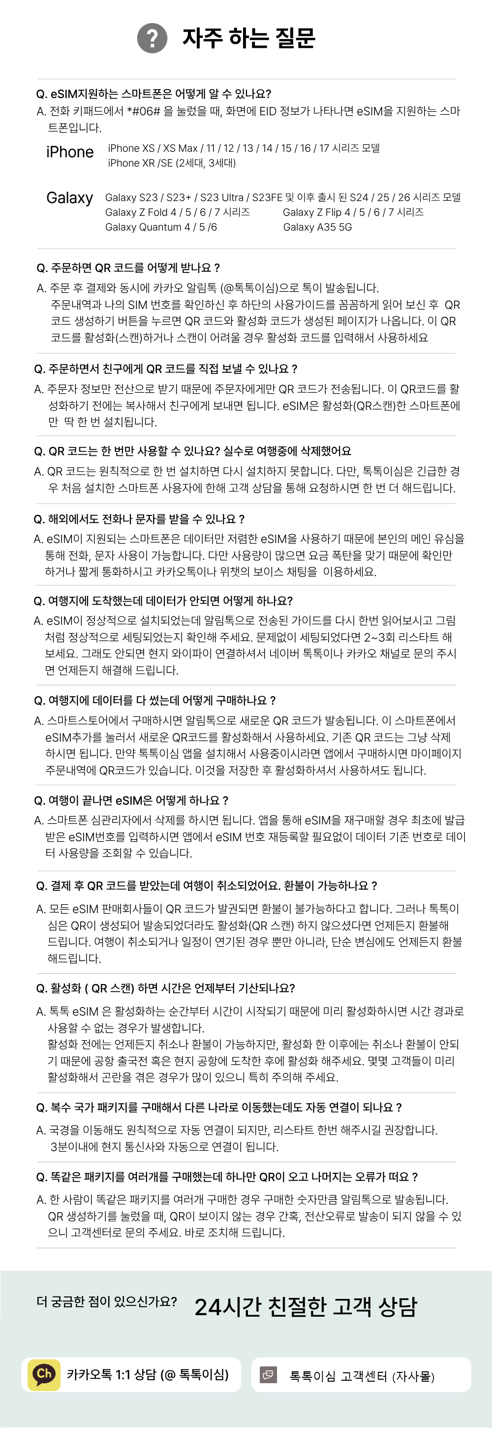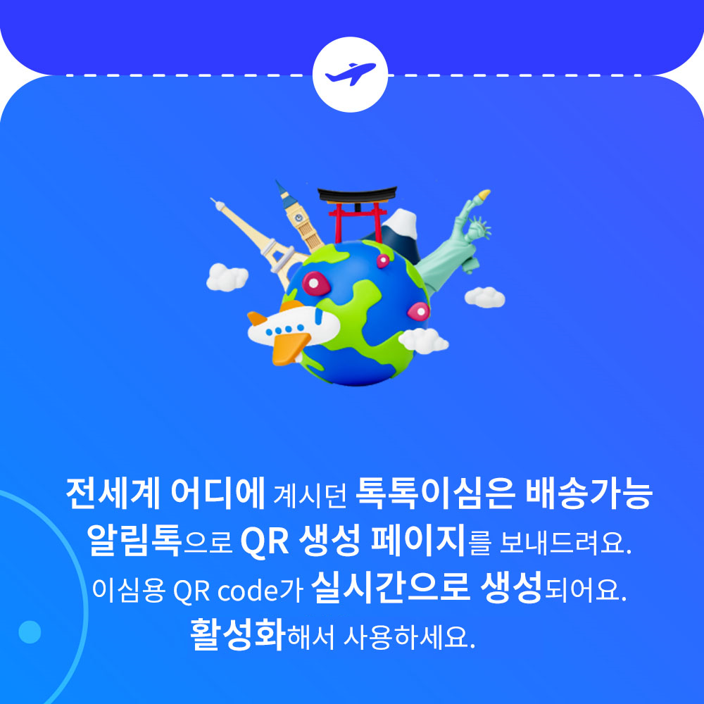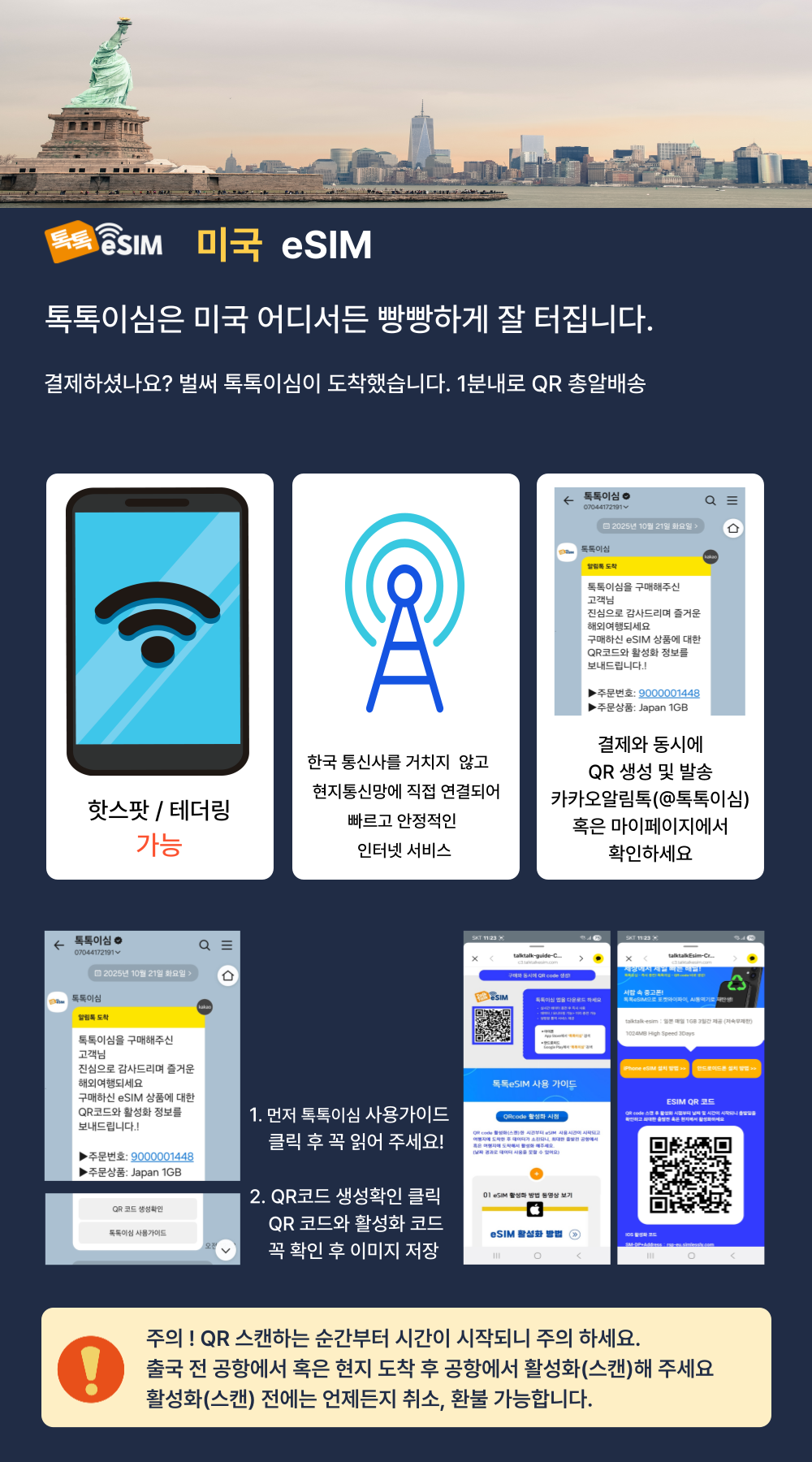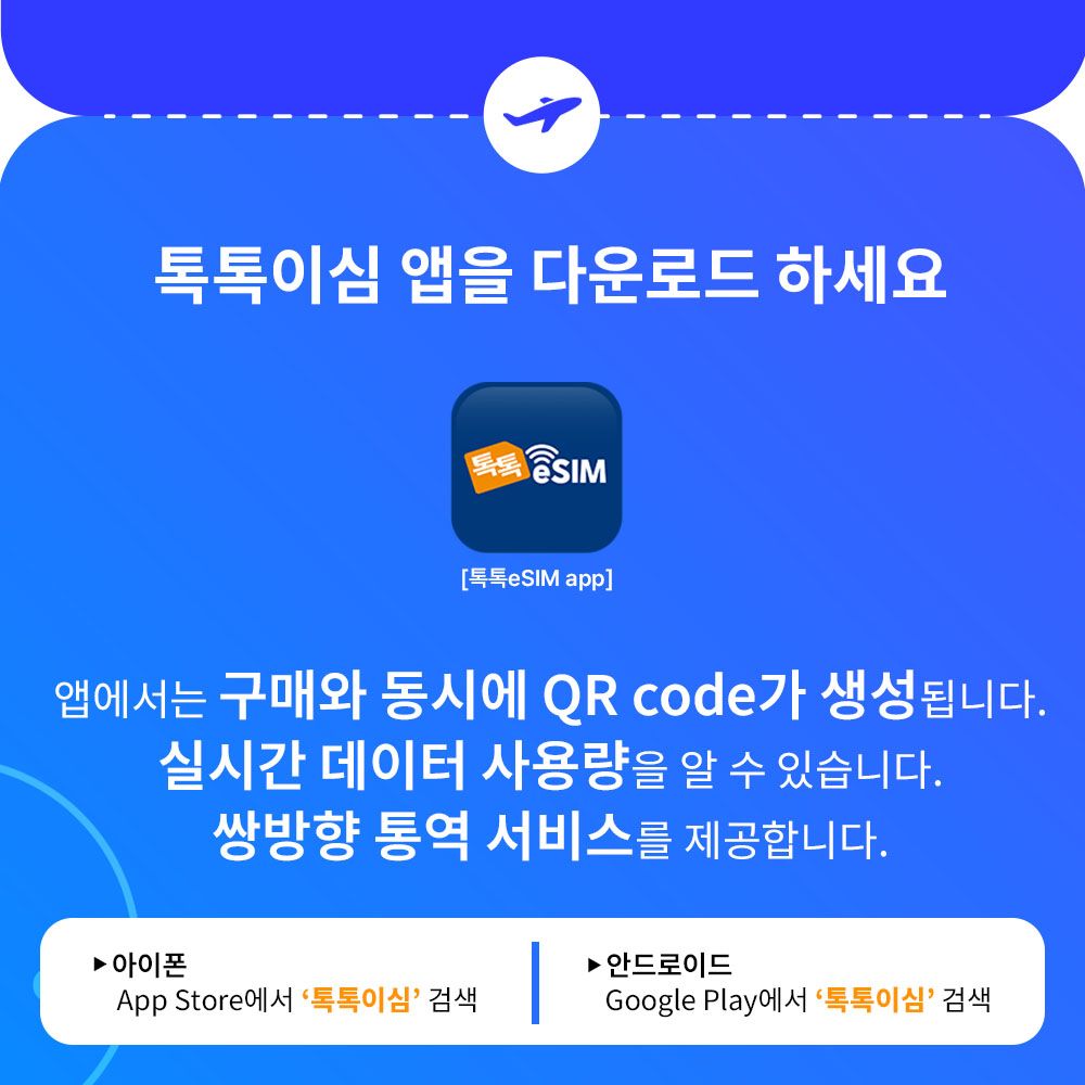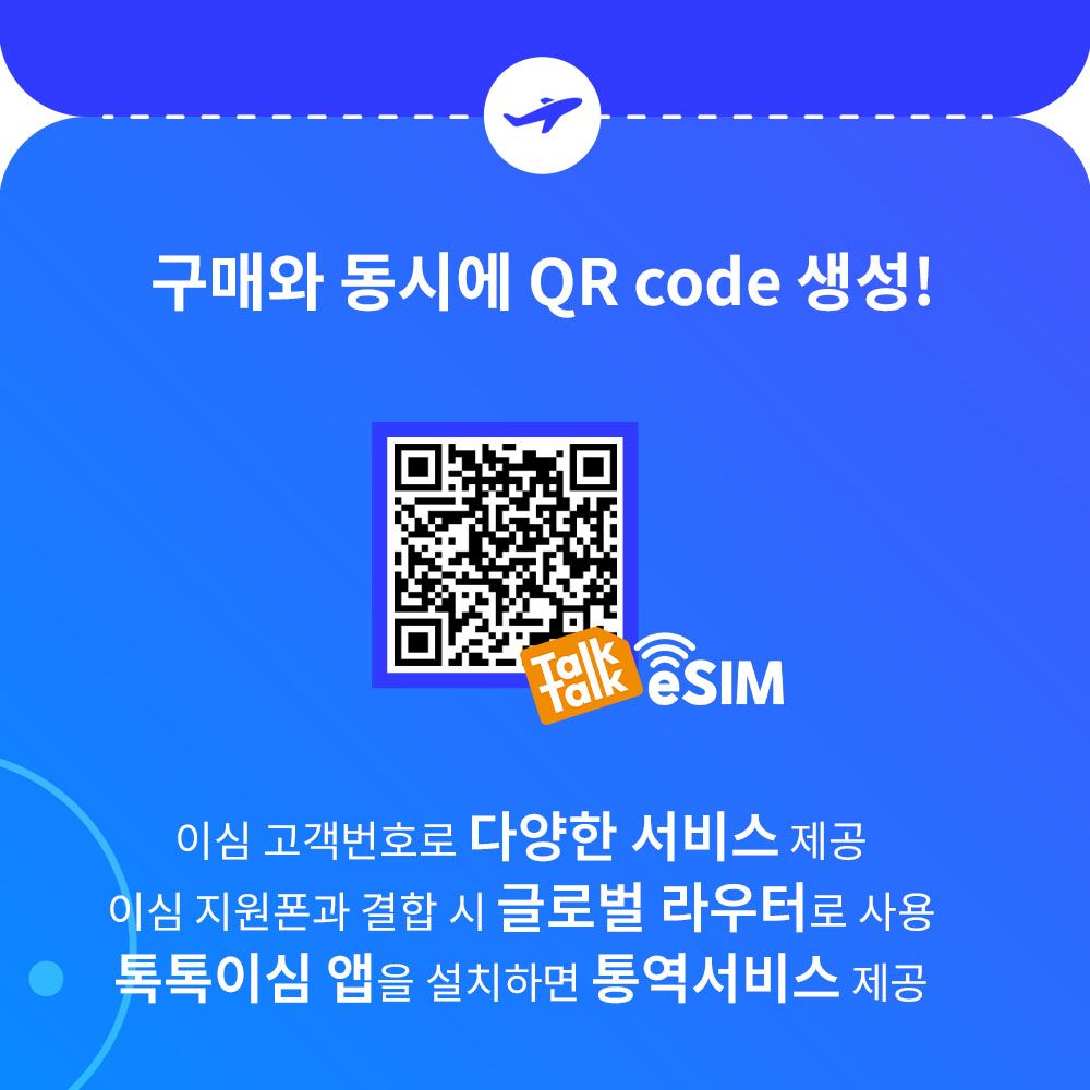구매한 eSIM을 QR코드 스캔(활성화)하면 취소/환불이 불가합니다. QR코드 스캔(활성화)한 시점부터 시간이 시작되니 공항에서 출발전 스캔(활성화 )하길 권장합니다. 톡톡이심 앱을 이용하면 실시간 데이터 사용량을 확인할 수 있습니다. 데이터 부족시 앱에서 바로 구매할 수 있습니다. 톡톡이심 앱에서 실시간 쌍방향 통역서비스를 무료로 이용할 수 있습니다.