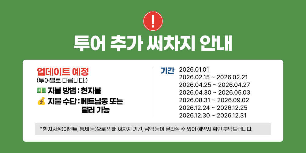 * 예약 안내 - 1인도 출발이 가능한 조인 투어 상품입니다. - 다국적 여행객들과 함께 조인하는 투어입니다. - 캐리어는 갯수에 따라 소지 가능 / 예약 전 미리 확인해 주세요. - 카시트 제공은 불가능 - 상기 일정을 날씨 또는 현지 상황에 따라 바뀔 수 있습니다. - 일정 및 투어는 현지 교통상황에 따라 변동 될 수 있습니다. - 투어 예약 후, 카카오 채널을 통해 여권 사진을 부탁드립니다. (여권 사진 미 제출 시, 예약 확정 불가) * 여행 주의 사항 - 당일 귀국 일정이 있으신 분들은 해당 투어를 추천하지 않습니다. - 카약 / 뱀부보트 이용시 구명조끼를 반드시 착용해야 합니다. - 개인의 부주의 등으로 인한 사고의 경우 가이드가 도움을 드리기 어려울 수 있습니다. - 해외 여행 중 발생할 수 있는 만일의 사고를 대비하여 여행자 보험 가입을 가급적 권장합니다. - 최소 모객인원 미만 모객 시 투어가 취소될 수 있습니다. - 투어 시 소지품을 분실하는 경우 되찾는 것이 어려우니 주의해주세요. - 픽업 시간에 지각하시거나 나타나지 않으실 경우 투어 이용이 어려울 수 있습니다.