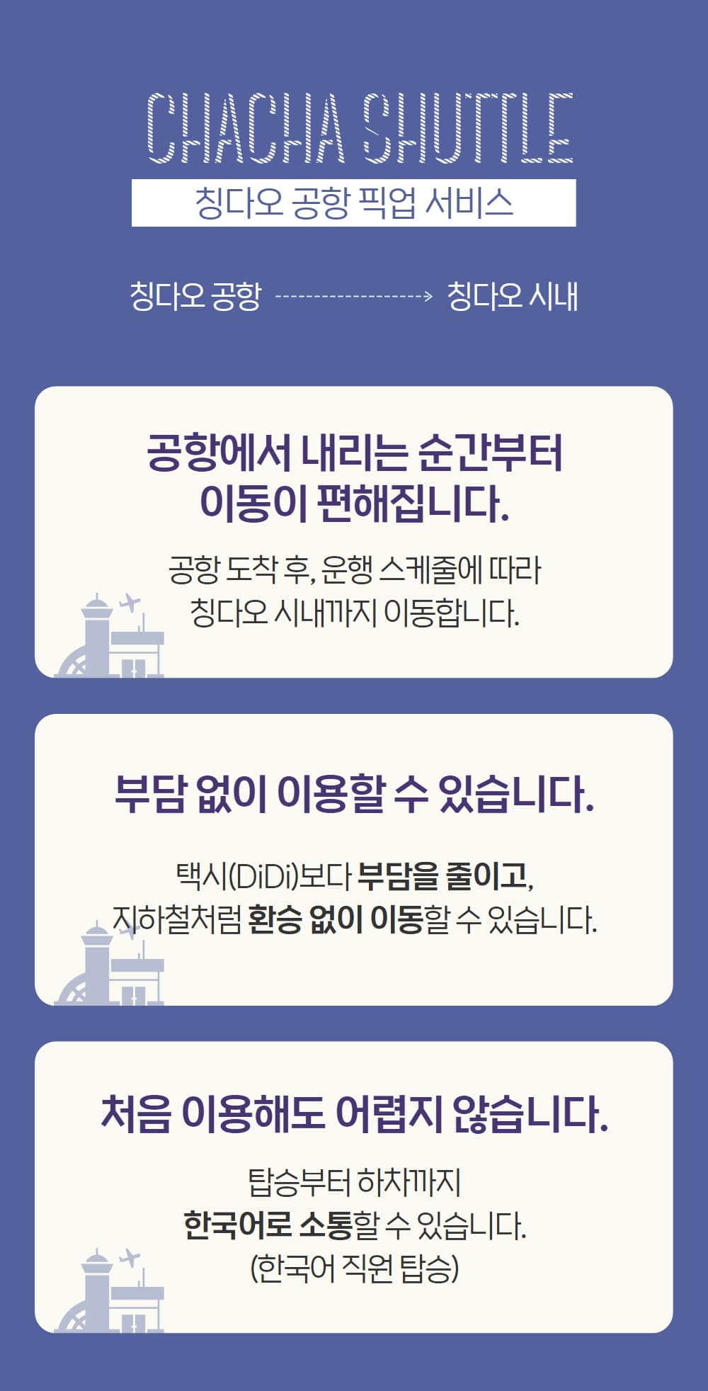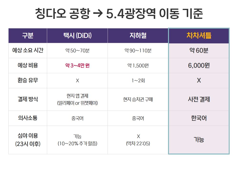칭다오 공항에서 시내까지의 여정을 더욱 편리하게 만들어줄 차차셔틀이 있습니다.