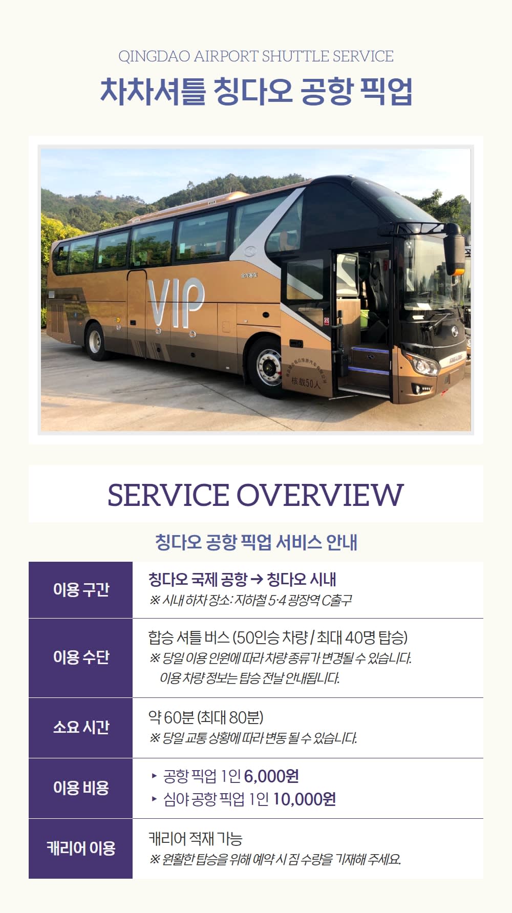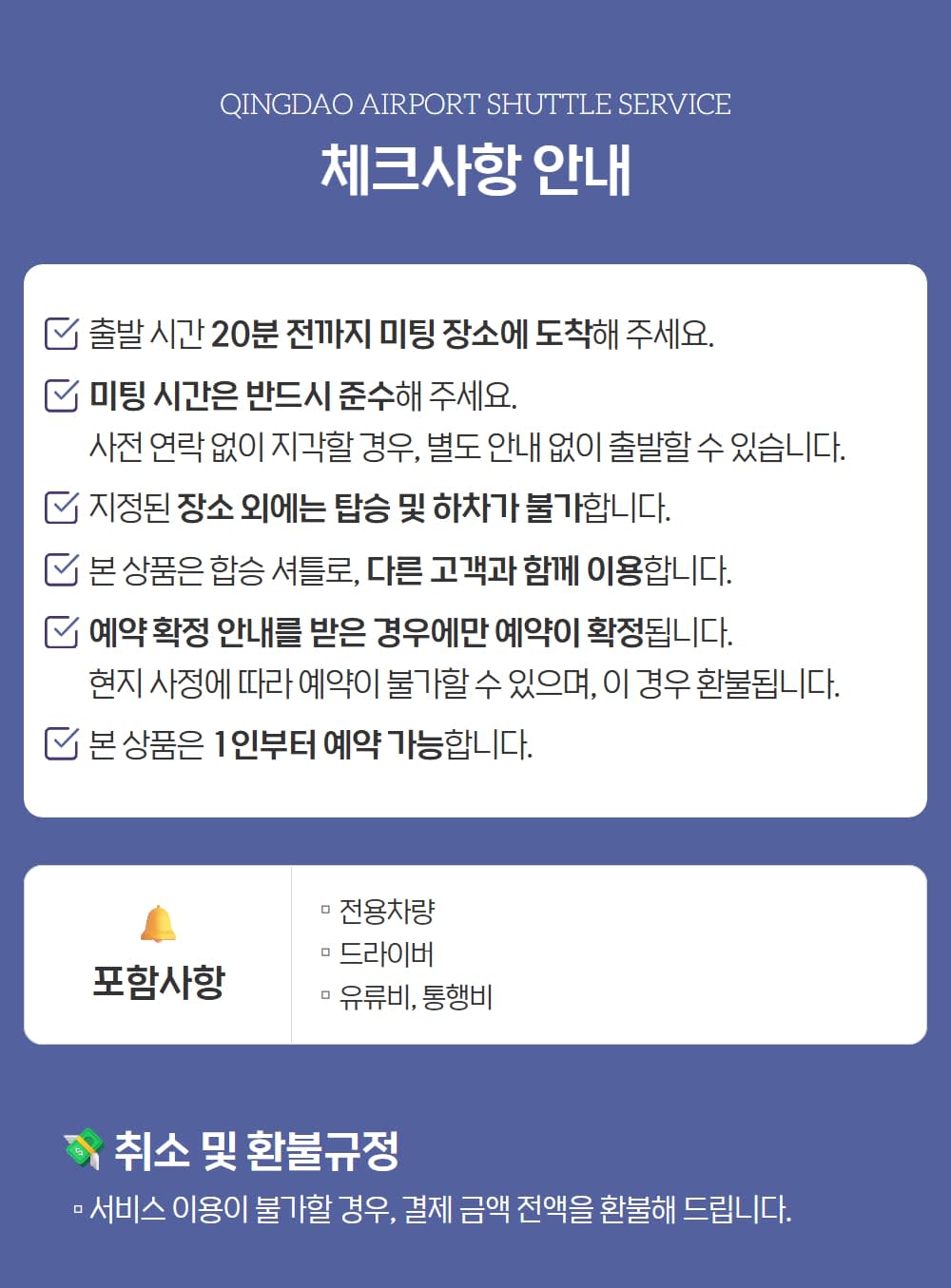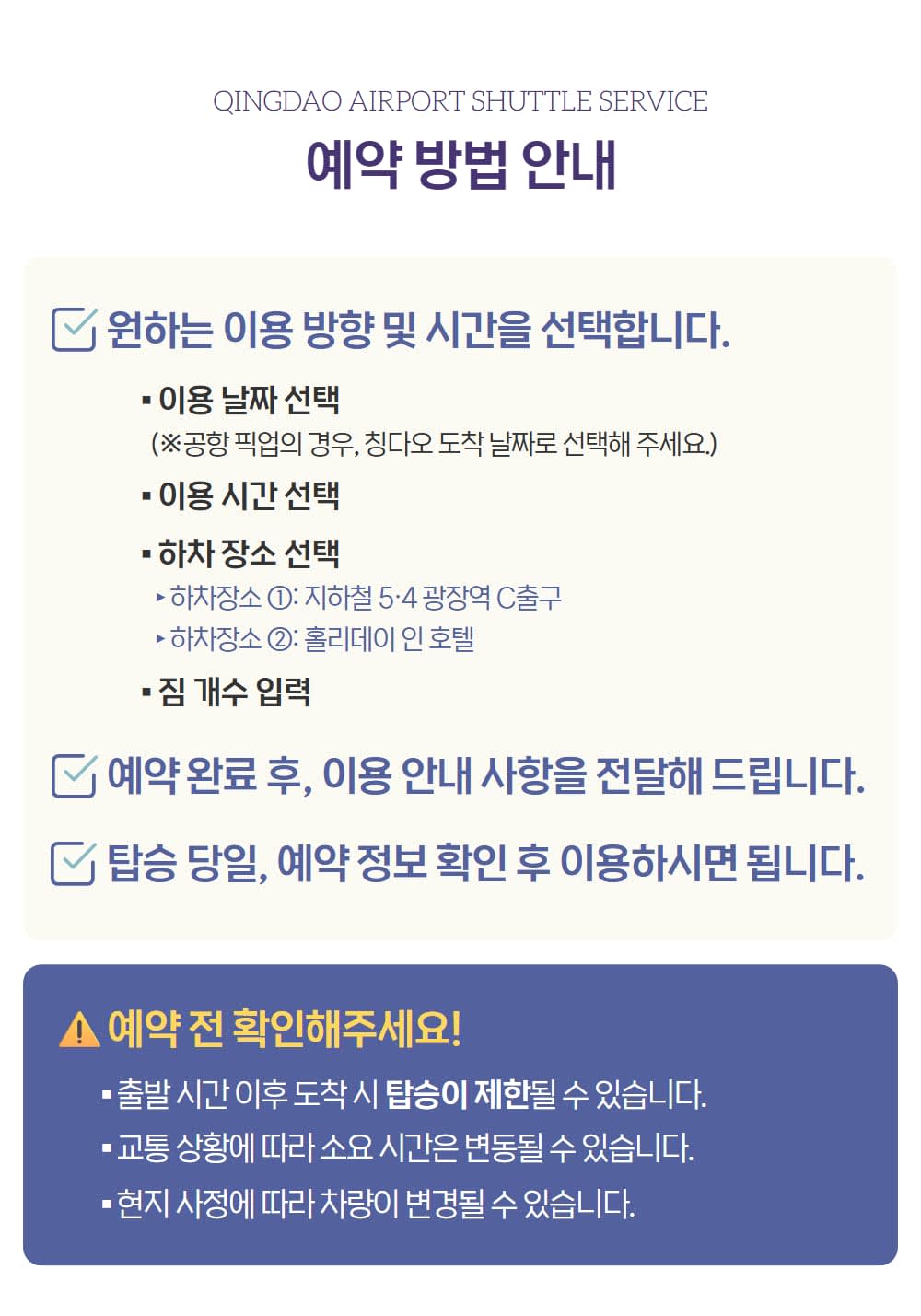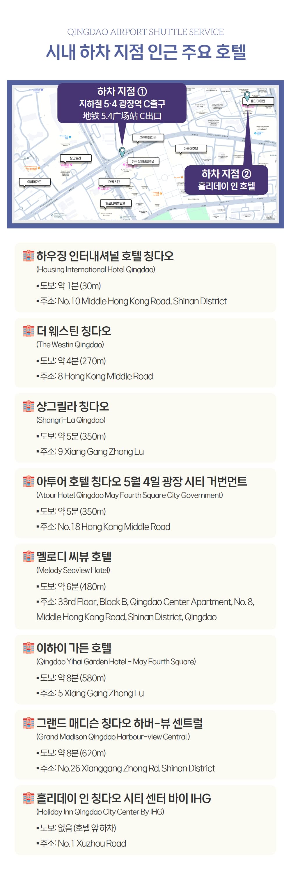 칭다오 여행을 최적화하고 편리하게 이동하세요. 공항에서 시내까지 안전한 셔틀버스를 이용해 편안한 여정을 시작해보세요.