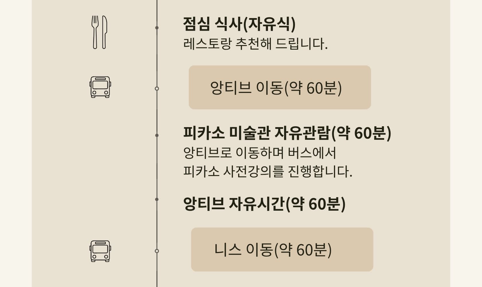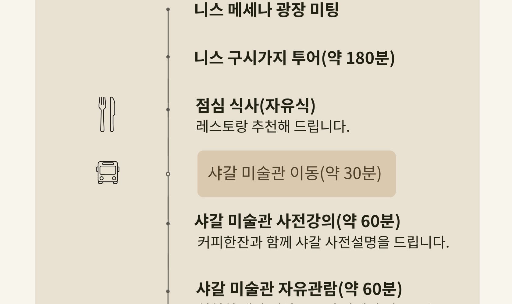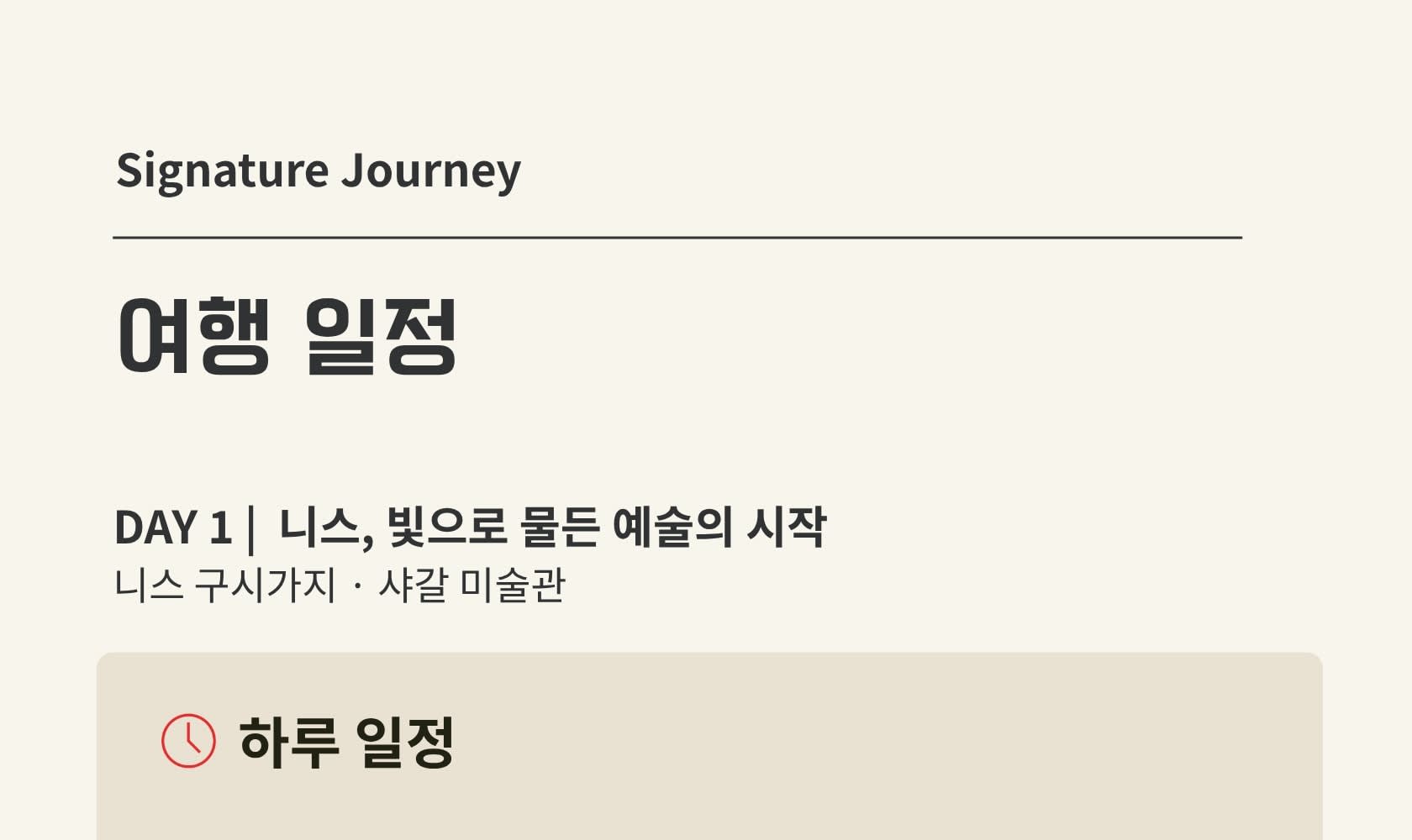 📍 니스 마세나 광장 미팅 📍 니스 구시가지 워킹 투어 (약 3시간) 📍 점심 자유식 (약 1시간 30분) 📍 샤갈 미술관 사전 설명 & 자유관람 (약 2시간) 📍 저녁 자유식 🚌 Day 1 종료
